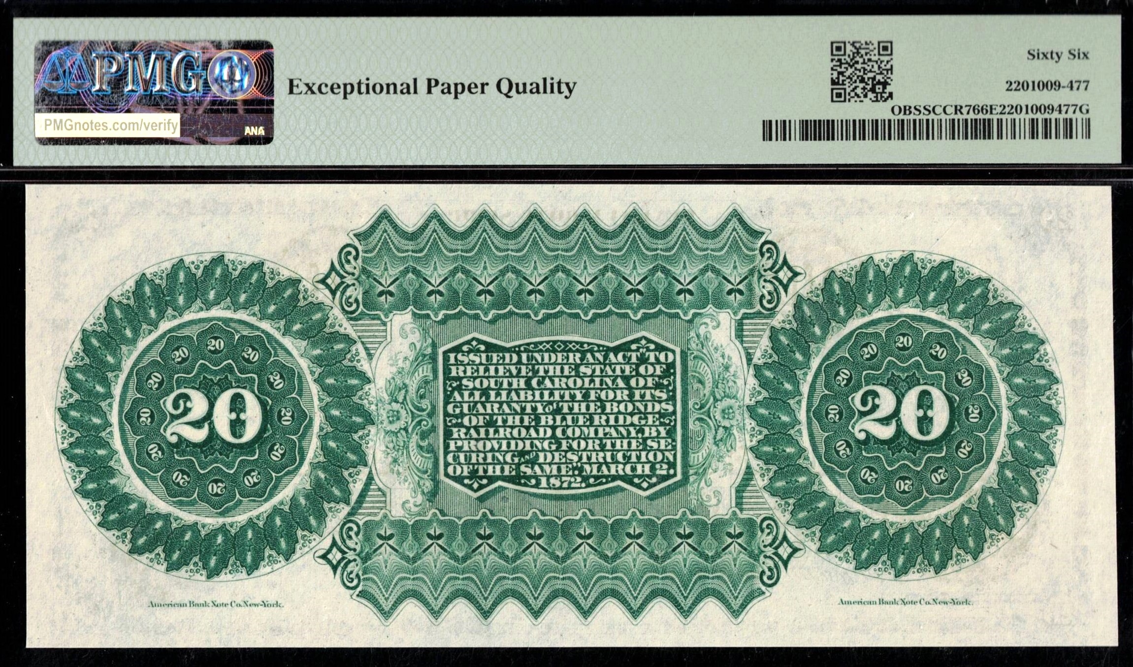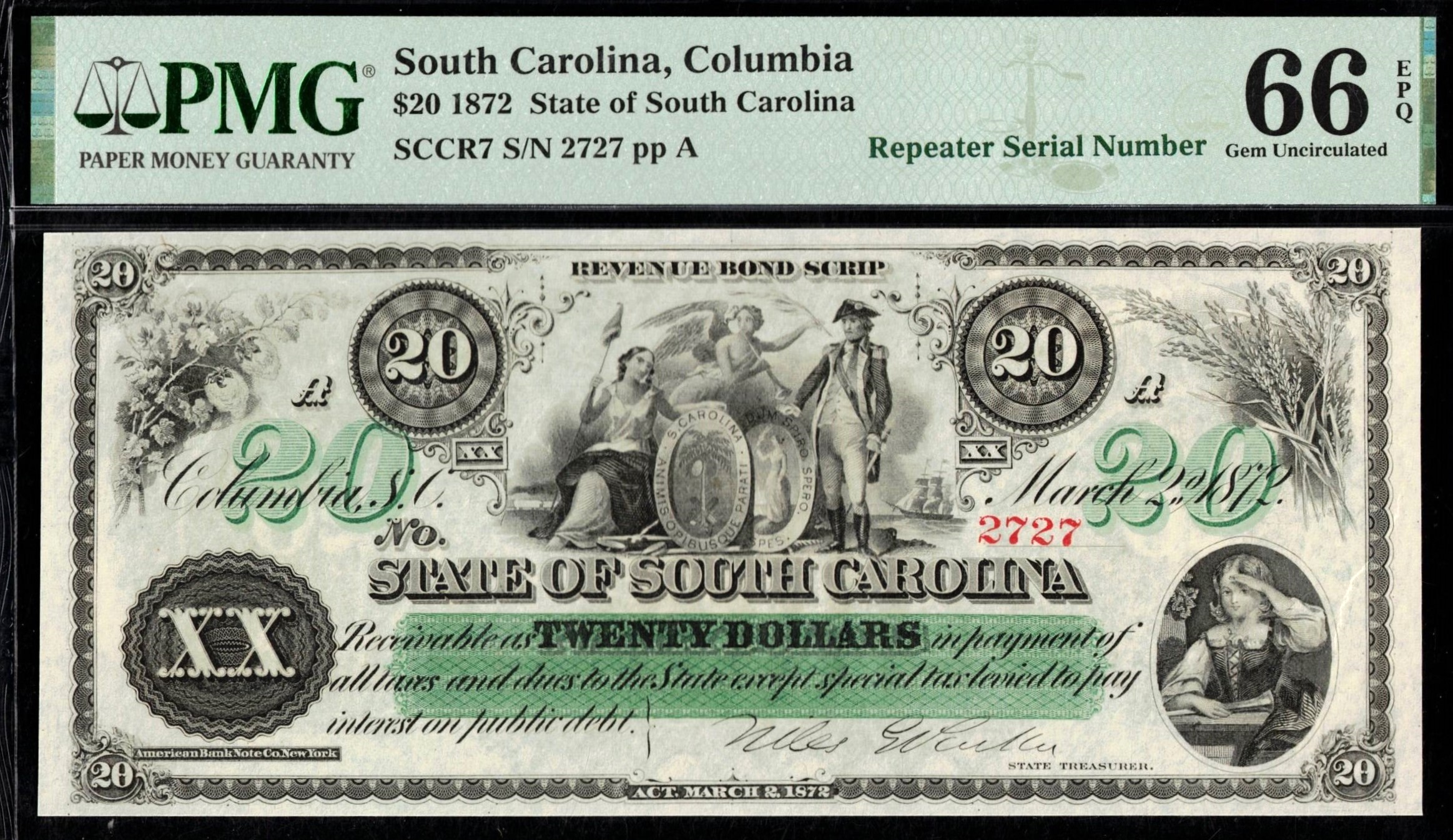 1872 State of South Carolina Obsolete Banknote. $20 Dollar Denomination SERIAL #2727 Repeater Serial Number. Third-party graded P.M.G #66EPQ Gem Uncirculated with exceptional paper quality. Very high grade with an excellent serial number, serial 2727, labeled on the P.M.G Holder.