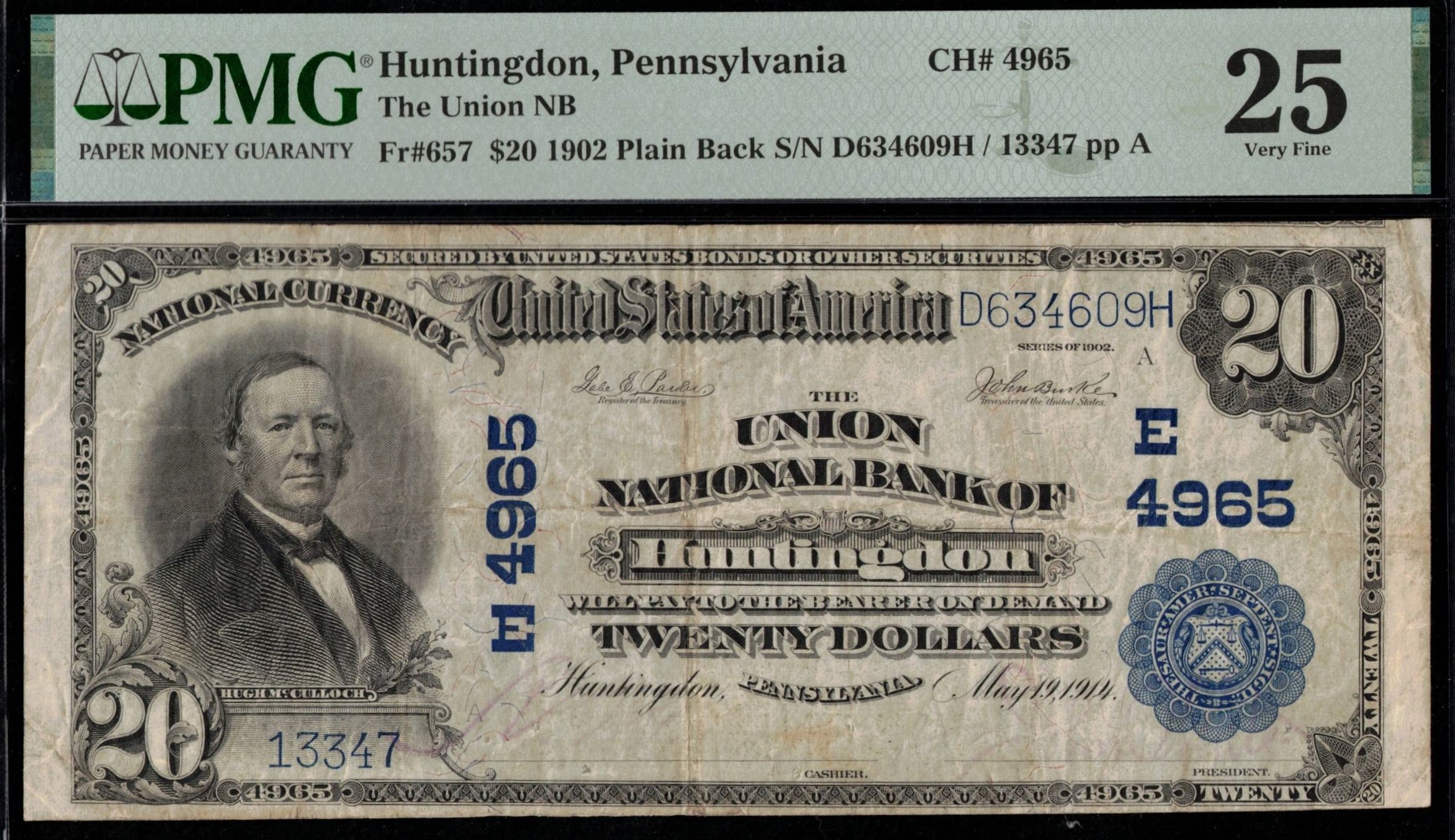 1902 SERIES $20 THE UNION NATIONAL BANK OF HUNTINGDON, PENNSYLVANIA. SERIAL 13347