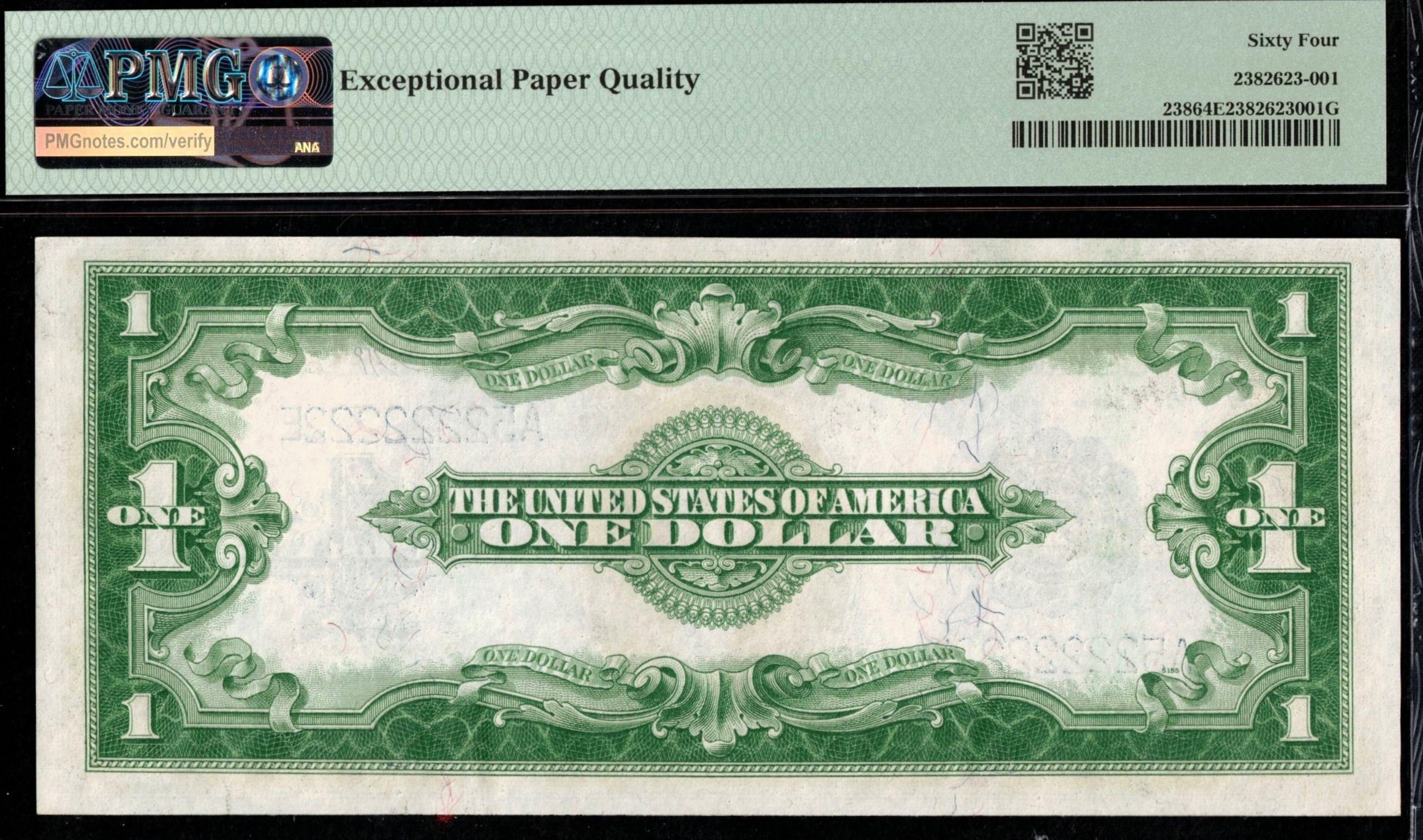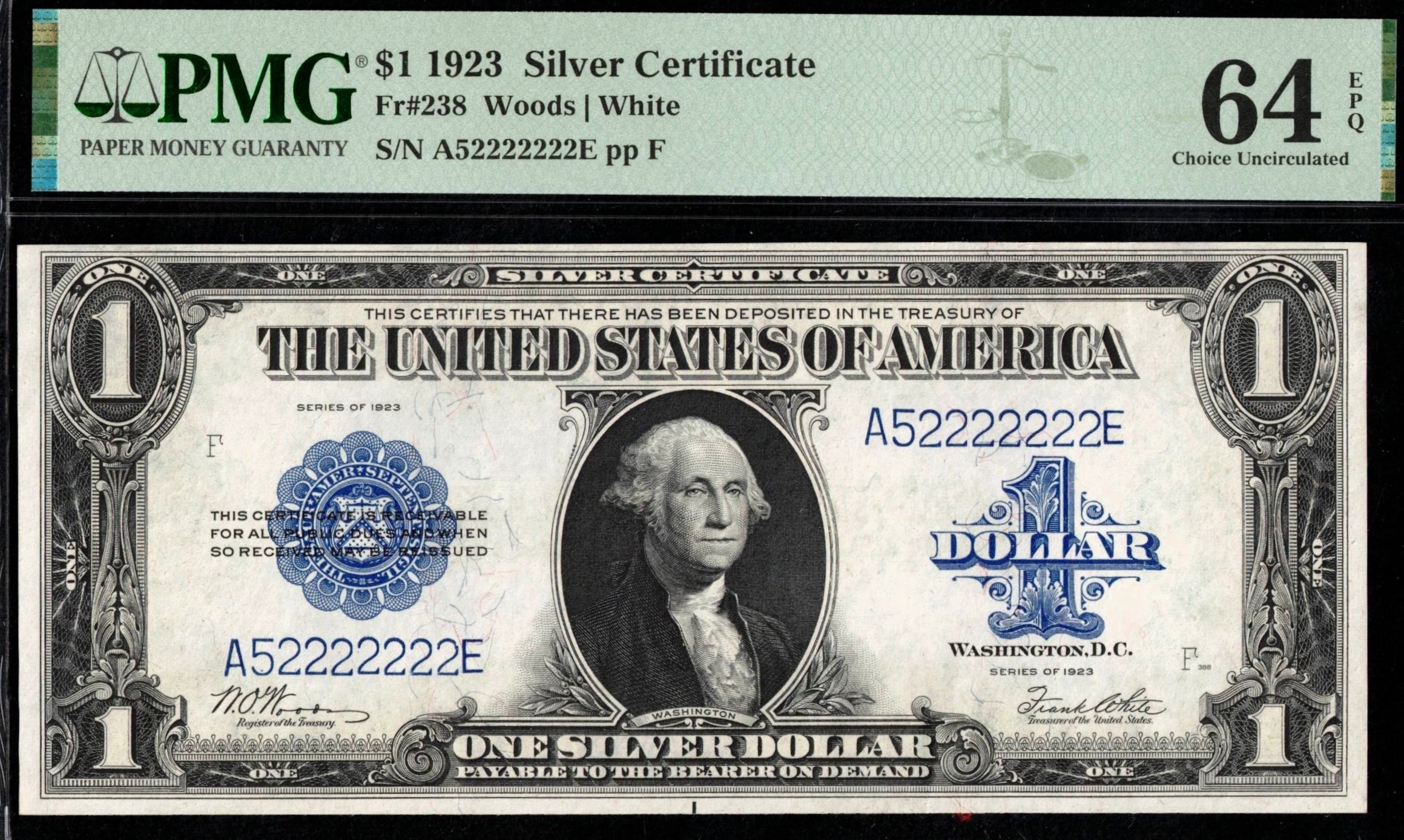 FR-238 1923 Series One Dollar Silver Certificate with a seven straight 2’s. A52222222E….. One digit away from that perfect Solid serial number having eight digits. Third party graded P.M.G #64EPQ Choice Uncirculated with exceptional paper quality. Sharp blue over-print, nice white paper, just not centered enough to call it a gem. Great looking seven straight serial number.