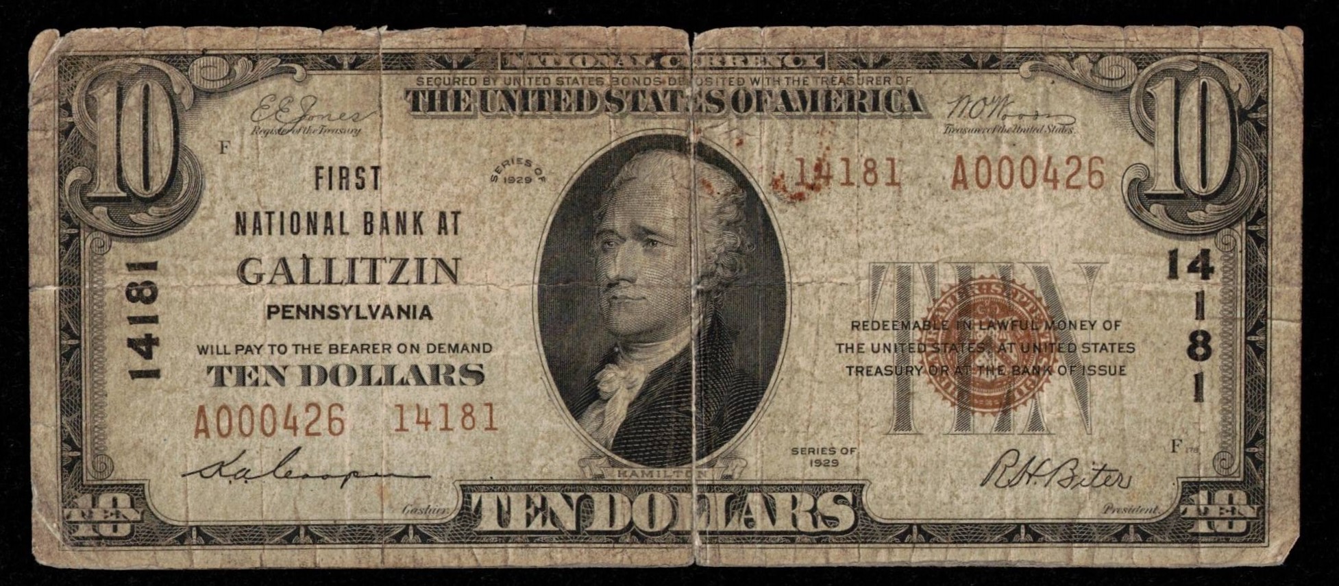 1929 Series $10 FIRST NATIONAL BANK OF GALLITZIN, PENNSYLVANIA. SERIAL A000426