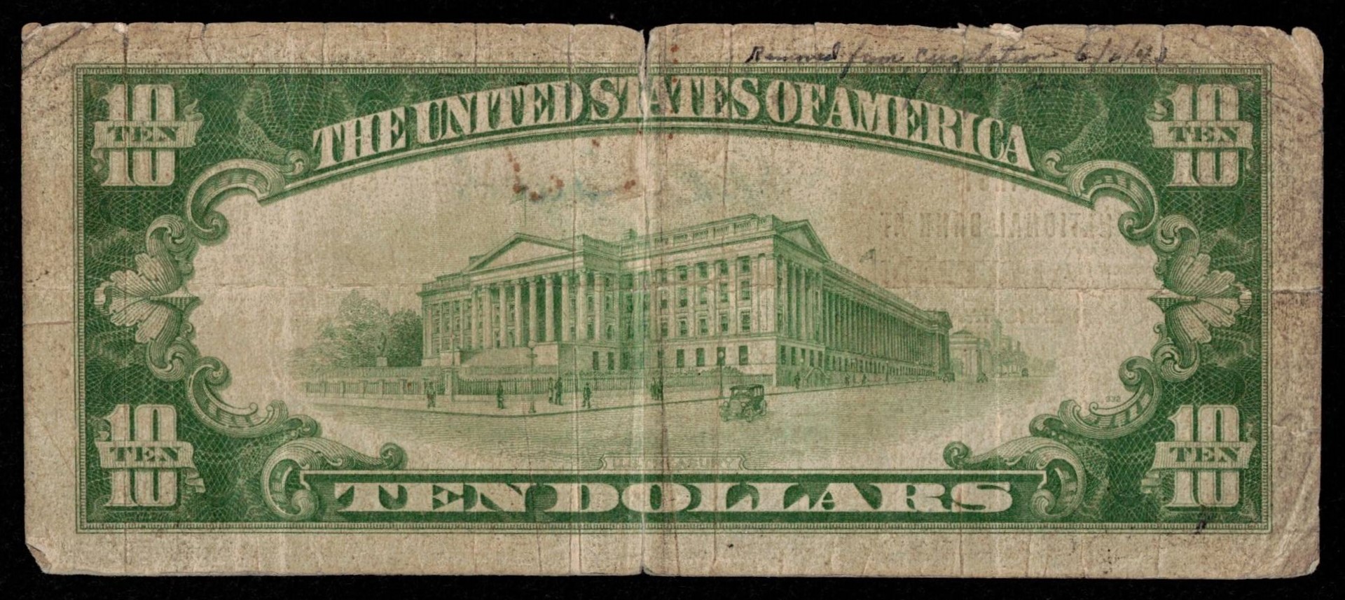 We graded this one as Very Good to Fine condition. It has some splits from wear and a pen ink notation on the back reading “pulled from circulation in 1943,” but it’s still intact with plenty of body left. This note would now be the third known in the census, alongside the only other two small-size notes—a $5 and a $20—both also graded VG. A rare national from the middle of the state, with just two others known and no large-size examples.