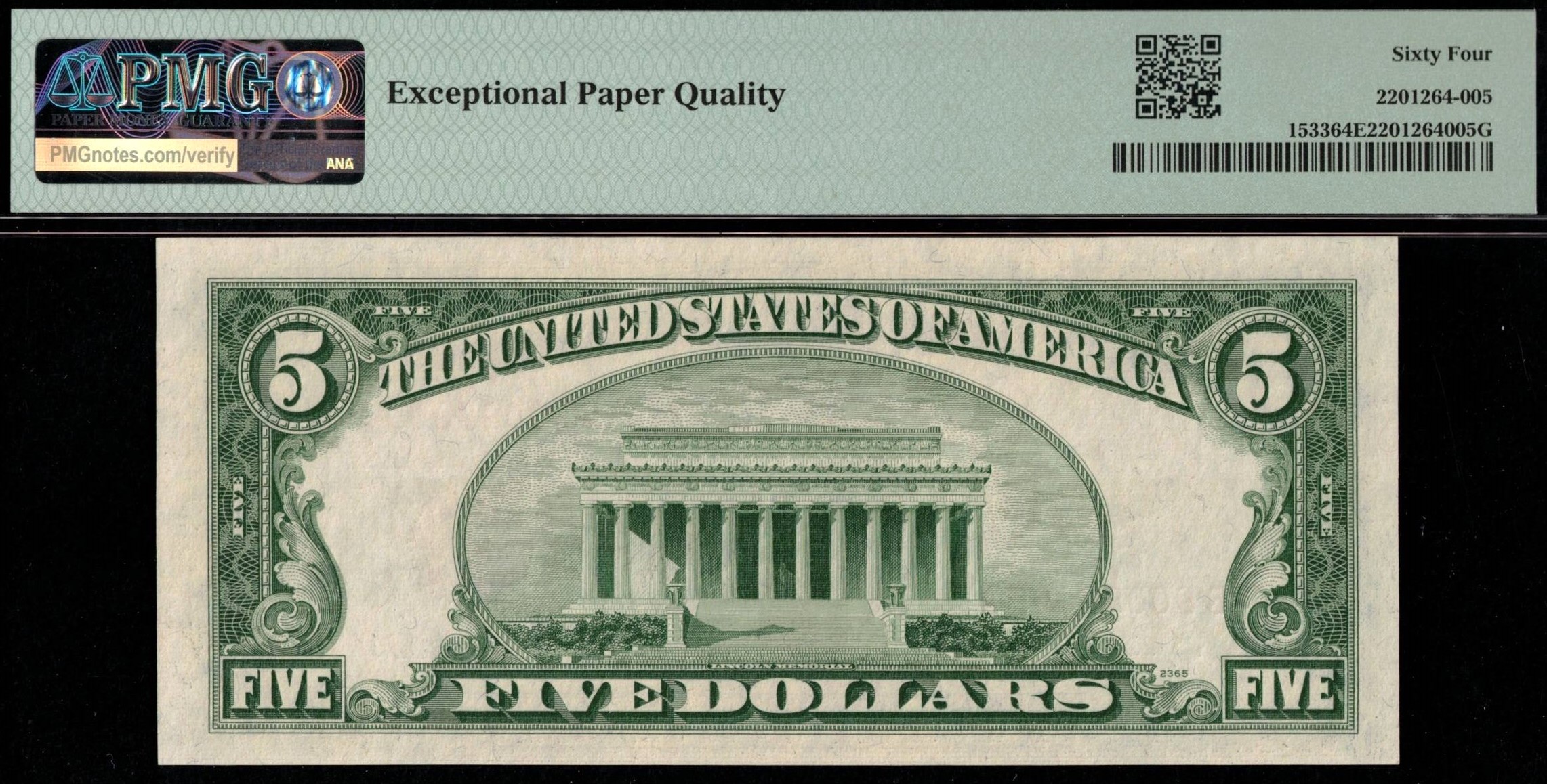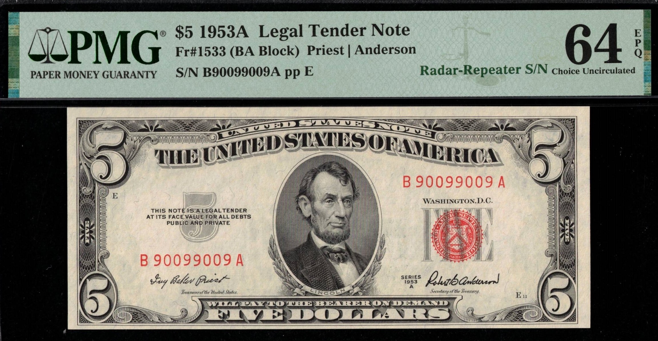FR-1533 1953A Series Five Dollar Legal Tender note boasts a rare two-digit radar-repeater combo serial number, B90099009A, consisting solely of zeros and nines. Bright and fresh from the pack, it displays sharp inks, excellent centering, and has been graded by P.M.G #64EPQ Choice Uncirculated for its exceptional paper quality. Two-digit radars on legal tenders are hard to find, as they’re only printed on $2, $5, and $100 denominations, making them much rarer than Silver Certificates or Federal Reserve notes. This particular note stands out even more with its repeater serial number combined with the serial number pattern, a combination seldom seen.
