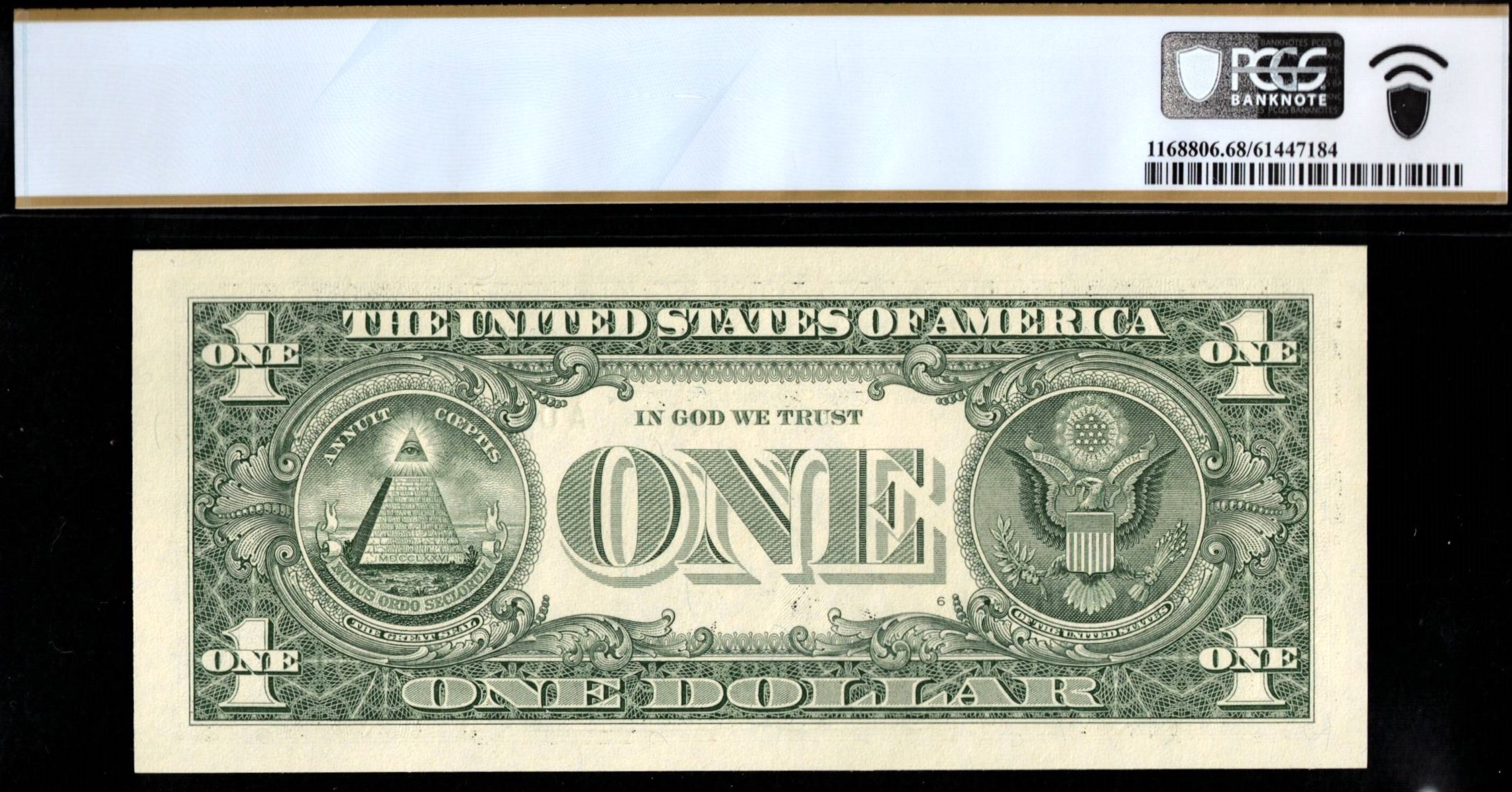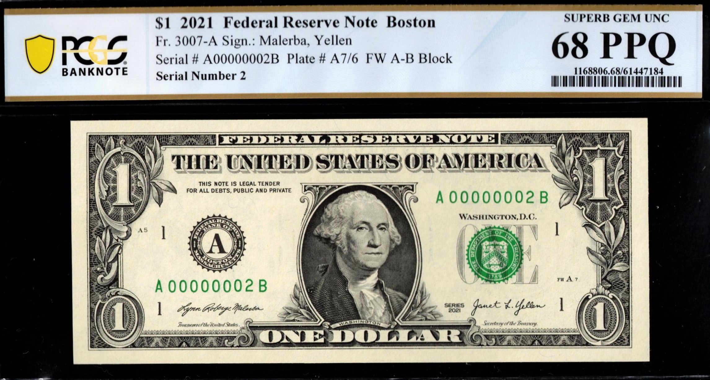 FR-3007-A 2021 Series One Dollar Federal Reserve Note from the Boston District featuring an exceptionally low serial number A00000002B. Graded by P.C.G.S as #68PPQ Superb-Gem Uncirculated with premium paper quality, excellent centering, vibrant color, and strong embossing. Lovely low serial number from one of the newest series issued by the Bureau of Engraving and Printing. A stunning note beautifully presented in a freshly graded P.C.G.S. holder. Each year, we used to see almost 10–12 Serial #1 notes appear on new series, but now you’re lucky to see even half that amount. Most of them are circulated, not fresh banded bricks from the BEP showing up at the bank to be pulled. One of the highest low serial #2 third-party graded examples we ever offered.