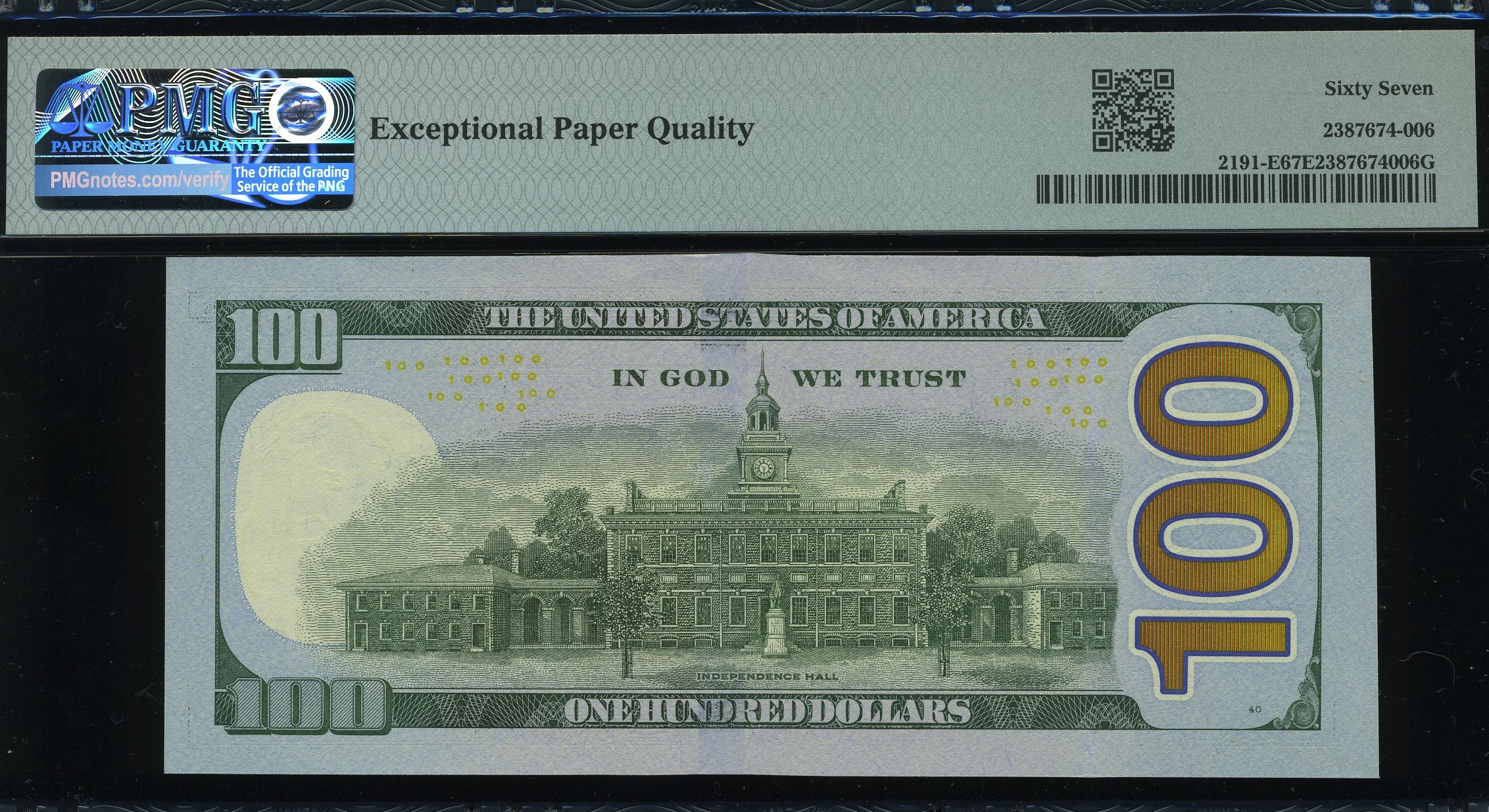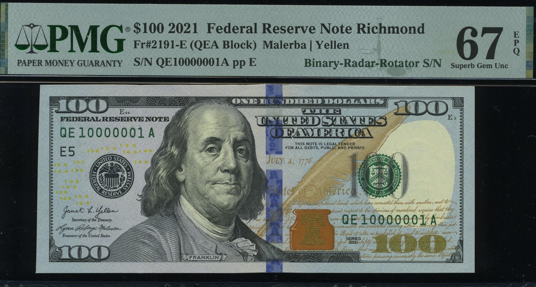 2021 $100 FRN QE10000001A 67Q