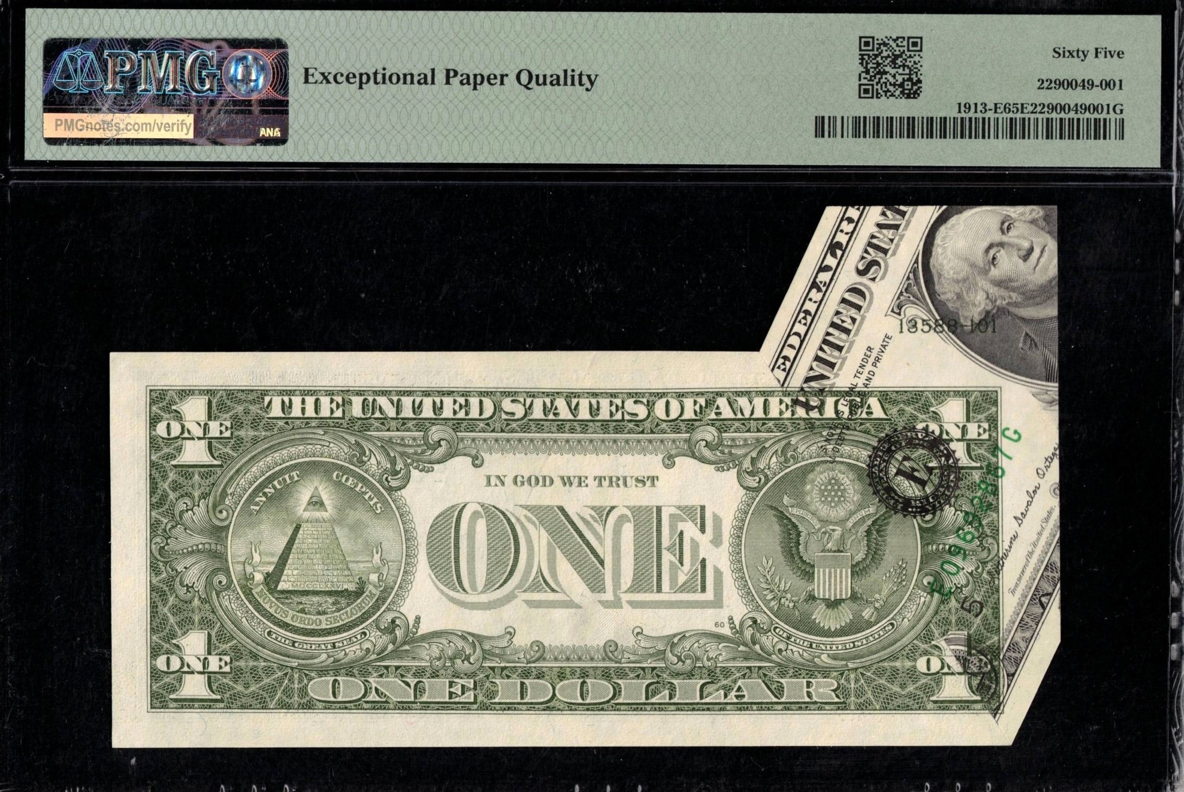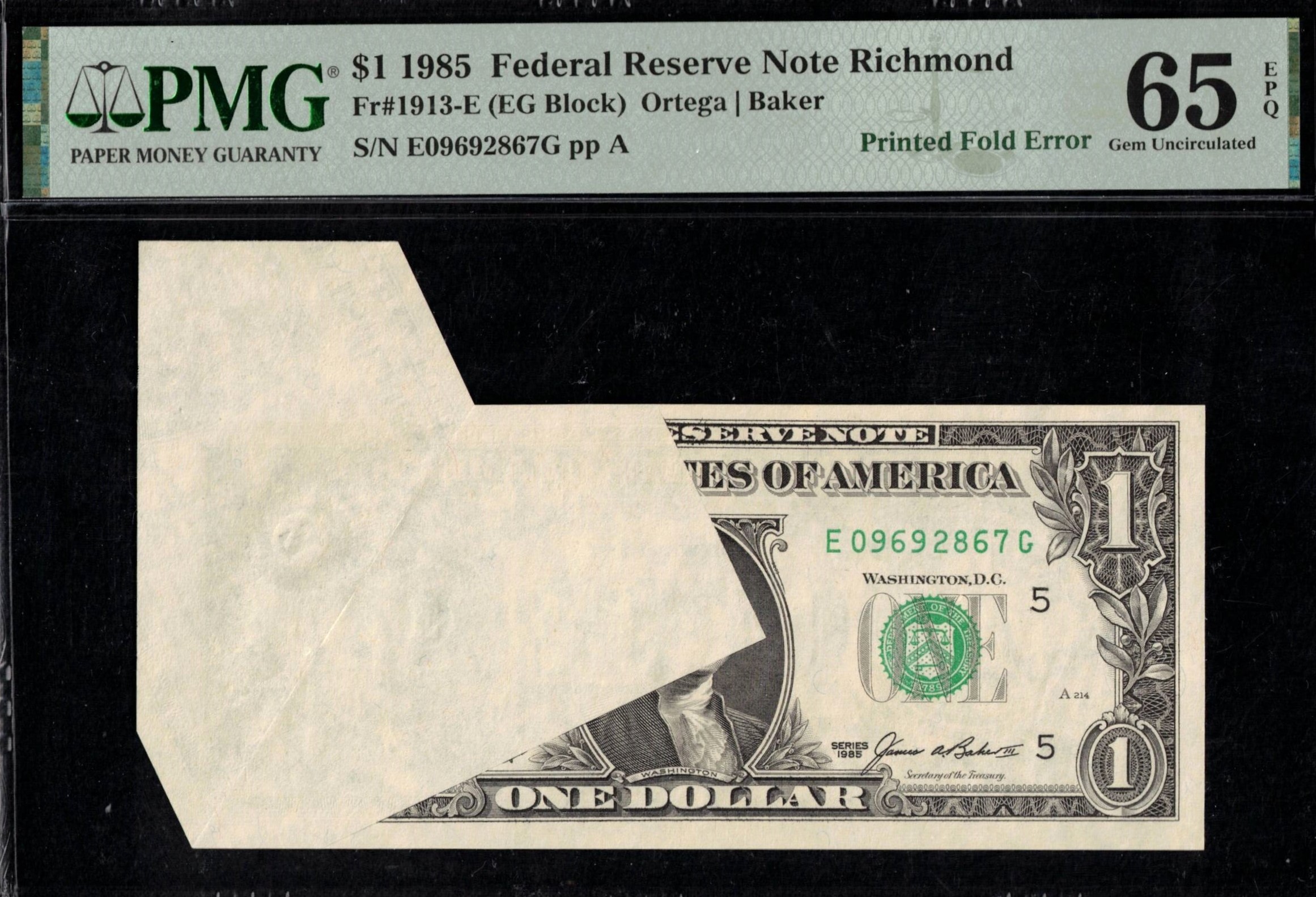 FR-1913-E 1985 Series One Dollar Federal Reserve note from the Richmond District was printed normally for the first run, but folded before the face design, creating a large fold that caught the plate sheet number. The face and overprint were then applied, and once unfolded, the note now displays prominently in a customized P.M.G. holder, graded P.M.G. #65EPQ Gem Uncirculated with exceptional paper quality—a striking presentational note. WOW~!
