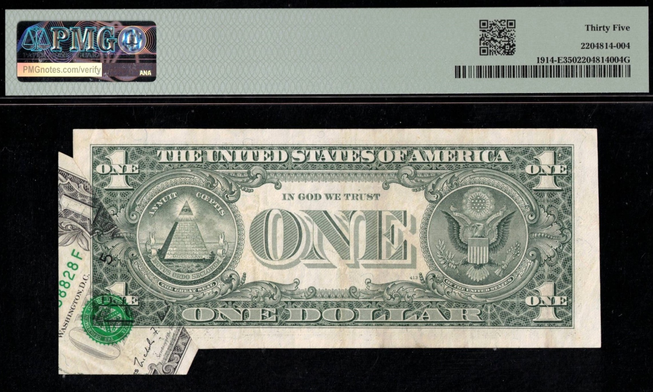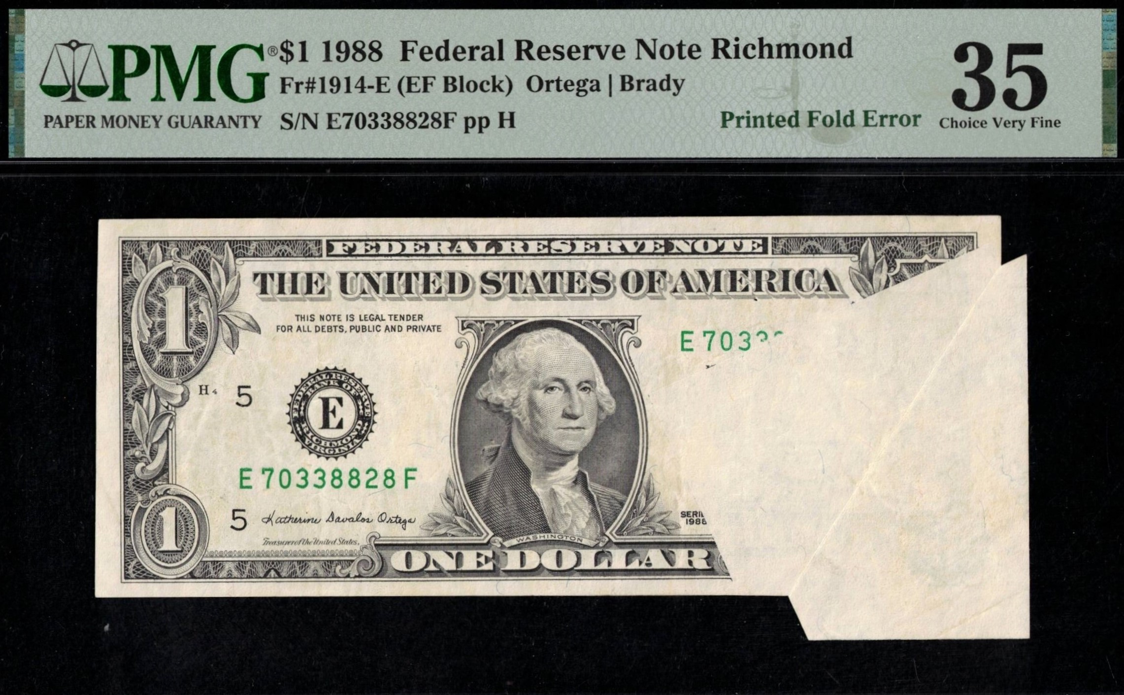 This FR-1914-E 1988 Series One Dollar Federal Reserve note from the Richmond District was folded before the face and overprint stages of printing. When opened, it reveals a large unprinted section covering most of the lower left side of the note, visible inside its custom-sized third-party holder. Graded P.M.G #35, very fine to extra fine, it’s just one point shy of a full extra fine. A striking display of a printing error in this holder.