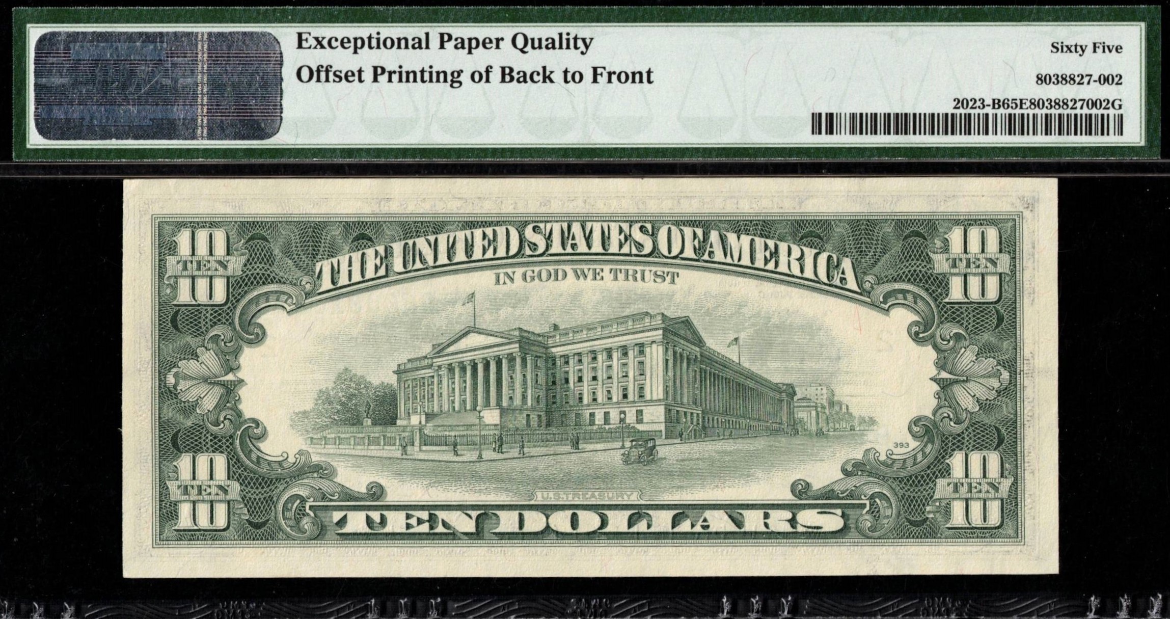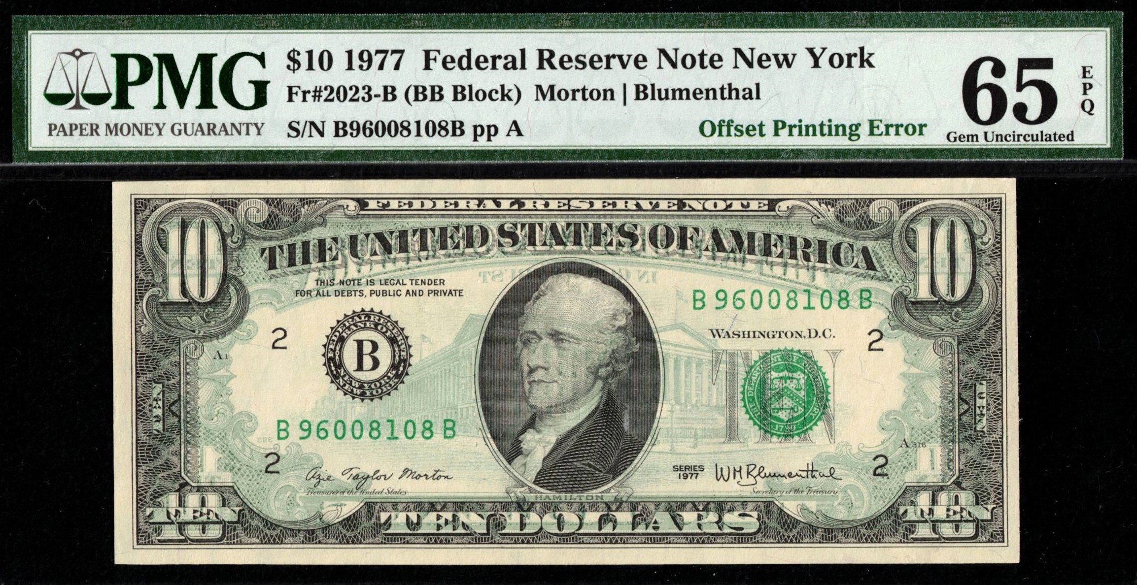 FR-2023-B 1977 Series Ten Dollar Federal Reserve note from the New York District, serial number B96008108B, has a striking full 100% transferred offset inking error from front to back. Graded P.M.G #65EPQ Gem Uncirculated for its exceptional paper quality, it’s nicely centered with a bold, dark ink plate transfer. A fresh-from-the-pack piece that beautifully highlights the ghost image.