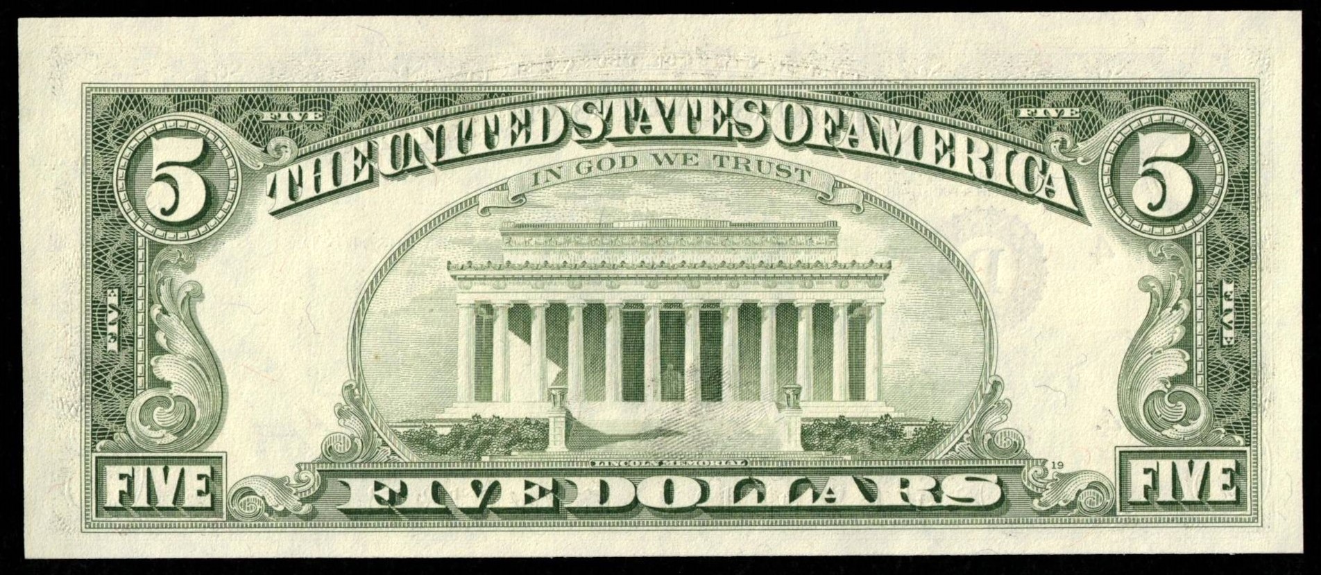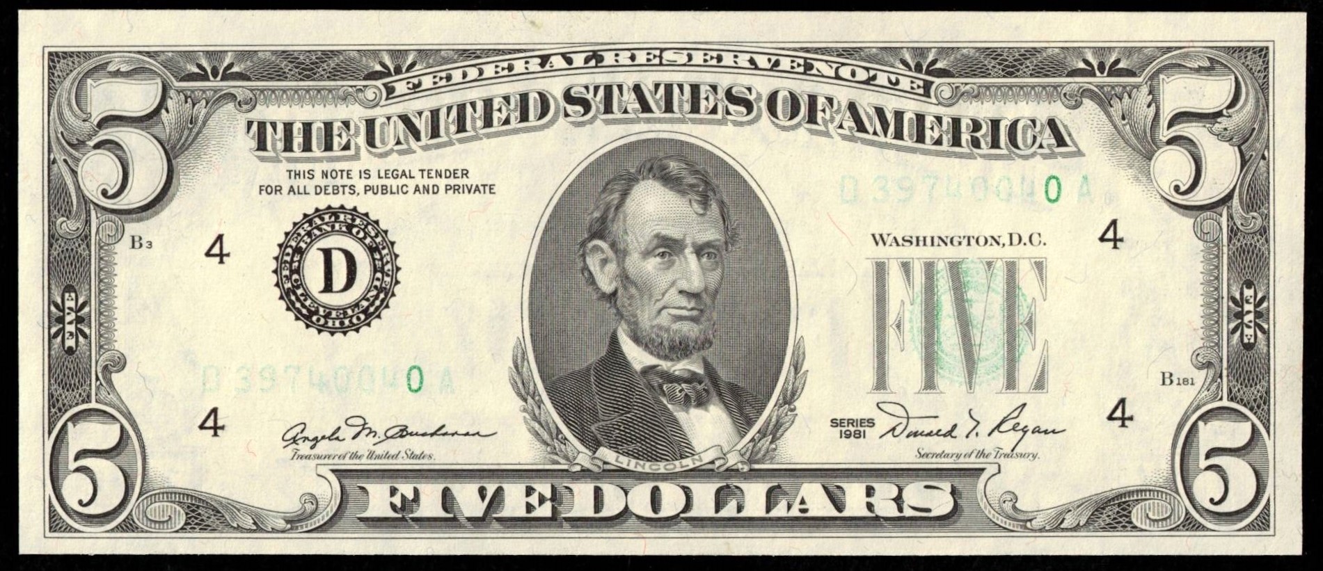 This 1981 Series Five Dollar Federal Reserve note from the Cleveland District features the unusual “Serial 00000000.” While the first and second printings appear normal, the green ink fades out, leaving the Treasury seal and serial numbers faint or nearly absent. A single zero sits on both sides of the note, but under close magnification or to a trained eye, traces of green ink reveal the actual serial number D39740040A. It’s a striking piece with just one visible digit, graded Choice Uncirculated with original paper quality. Slightly off-center to be called a gem, yet with excellent paper quality, embossing, and a sharp look.