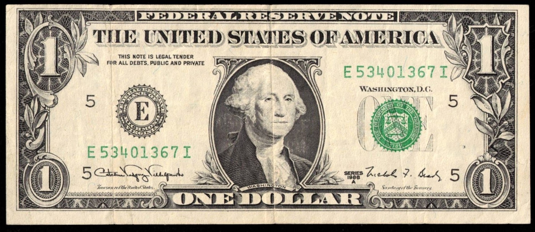 FR-1919-E 1988A Series One Dollar Federal Reserve note from the Richmond District, serial #E53401367I, plate 3/2, features a notable back misalignment. While such errors aren’t extremely rare on standard series and denominations, they’re much scarcer on web-press notes. Web-press one-dollar bills were printed only for the 1988A, 1993, and 1995 series. This example we graded Very Fine Plus, this problem-free note was pulled from circulation and represents a tough-to-find error from a short-lived printing process.