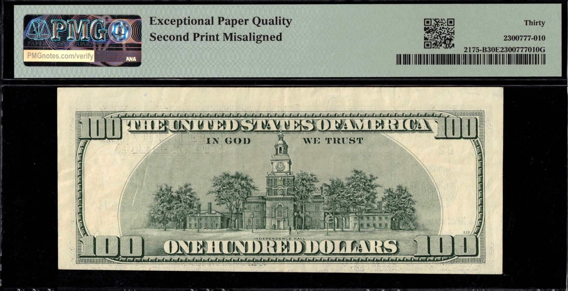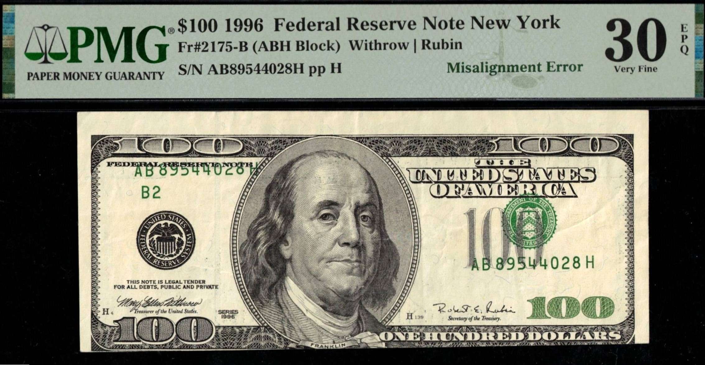 FR-2175-B 1996 Series $100 Federal Reserve note from the New York District, serial number AB89544028H, with a noticeable misalignment in the face print that caused the seal and serial numbers to be obscured during the overprint stage. It’s been third-party graded PMG #30EPQ, placing it in the Very Fine to Extra Fine range with exceptional paper quality. An original piece pulled from circulation; it’s part of the first-generation big head series $100’s..
