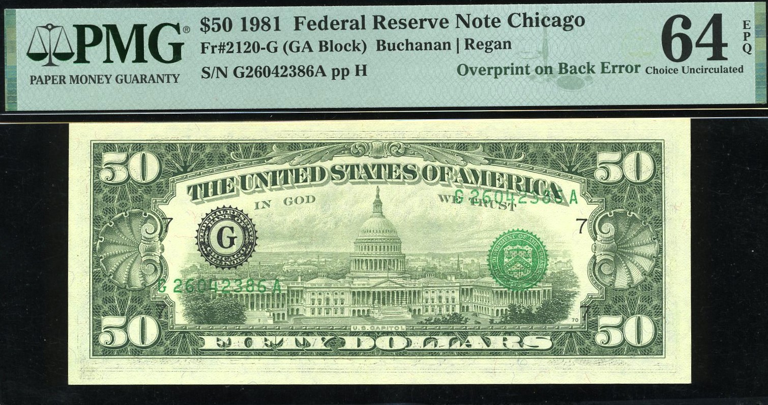 A dramatic and highly desirable third‑print‑on‑reverse error on this 1981 Series $50 Federal Reserve Note from the Chicago District. Created when the sheet was mistakenly fed back into the press on the same side as the first print, the Treasury seal and serial numbers were applied to the back of the note, producing a bold and unmistakable production anomaly.