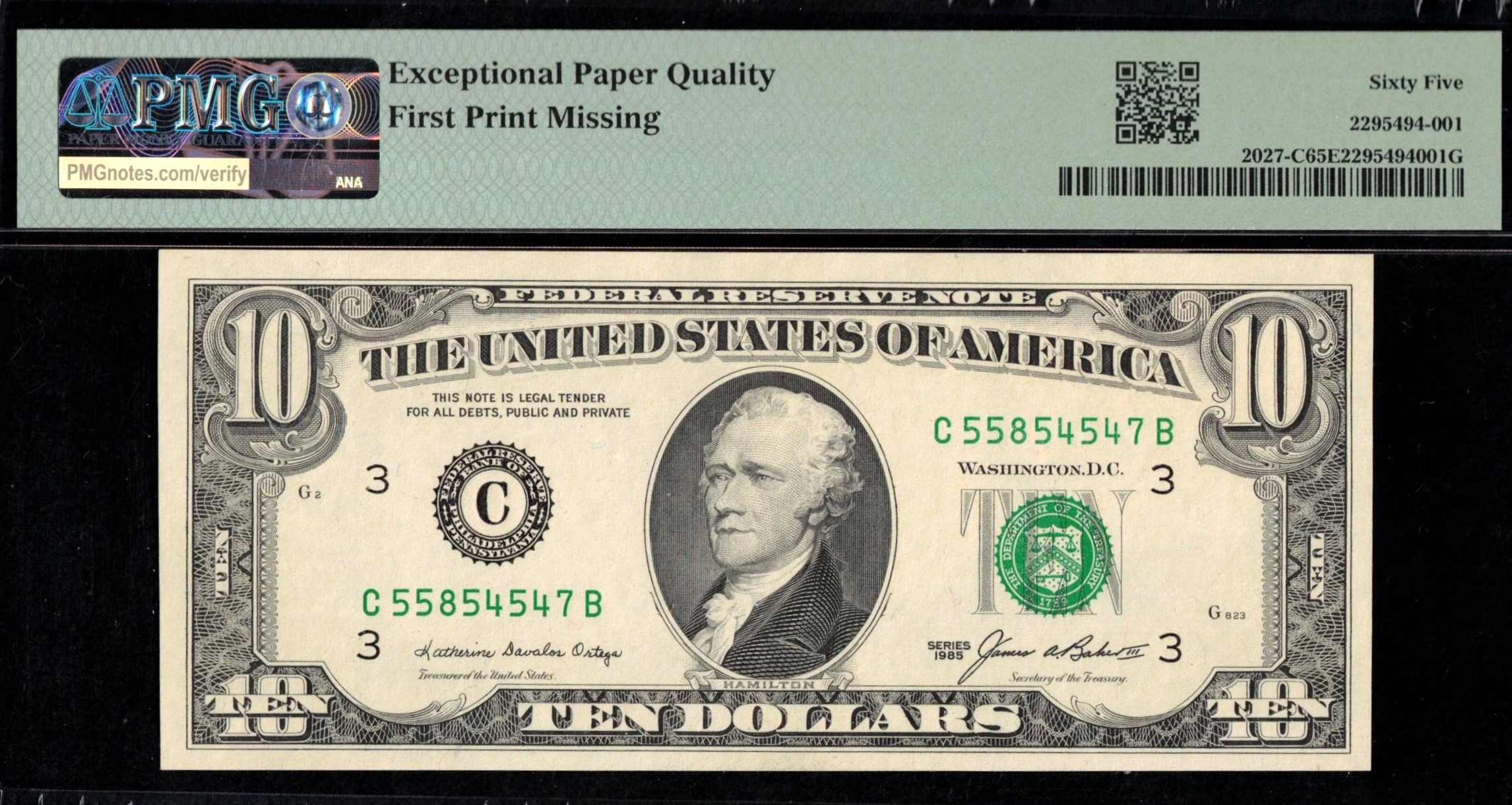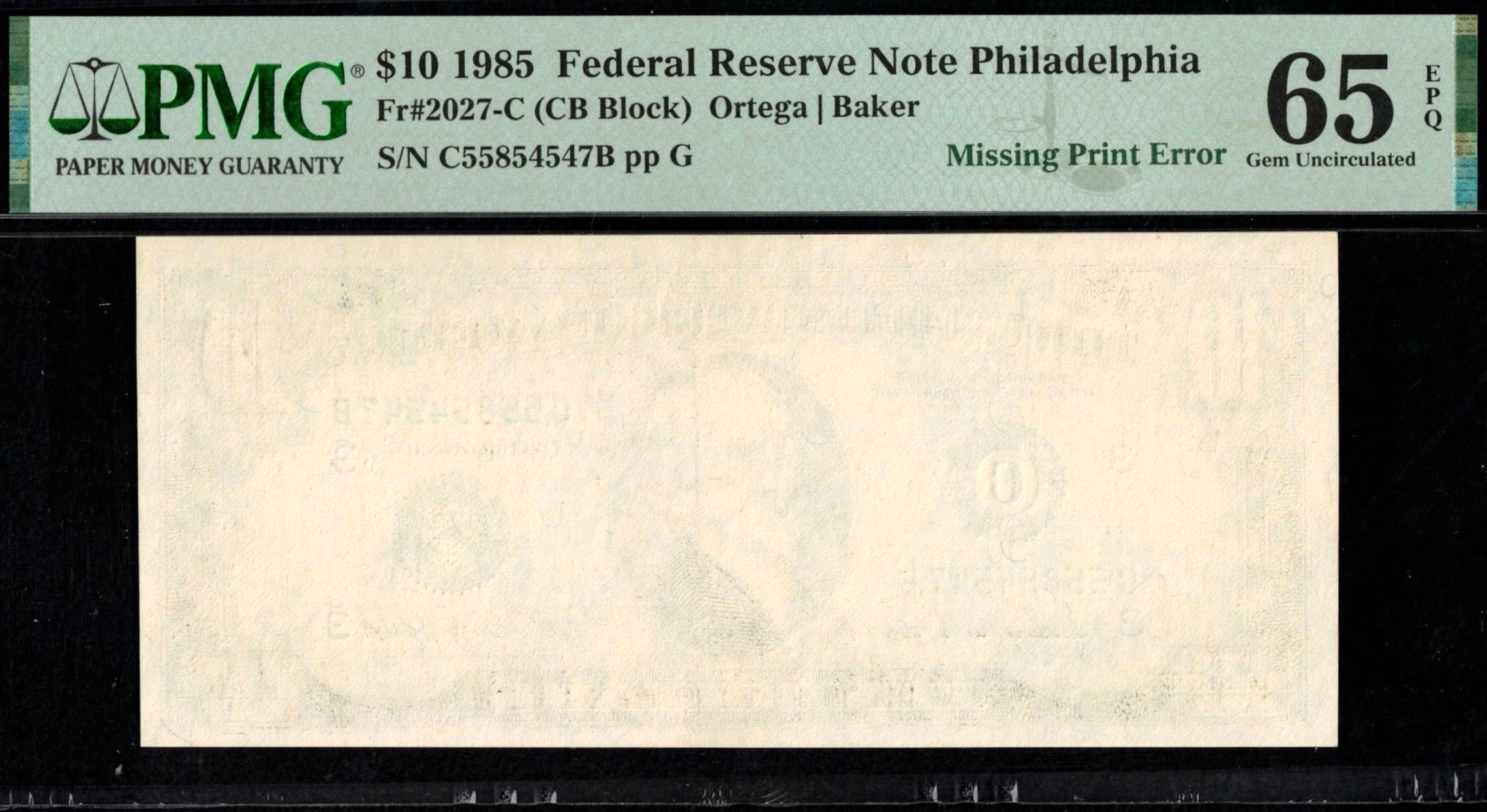 Fr-2027-A 1985 Series Ten Dollar Federal Reserve Note from the Philadelphia District, with a serial number ending in #47, was discovered tucked inside a pack of $10 bills. The back is entirely missing its ink, while the front printing, seals, and serial numbers appear as normal. Graded by PMG as #65EPQ Gem Uncirculated, it boasts exceptional paper quality and bright white surfaces, making it a sharp and striking example of a missing first print note.