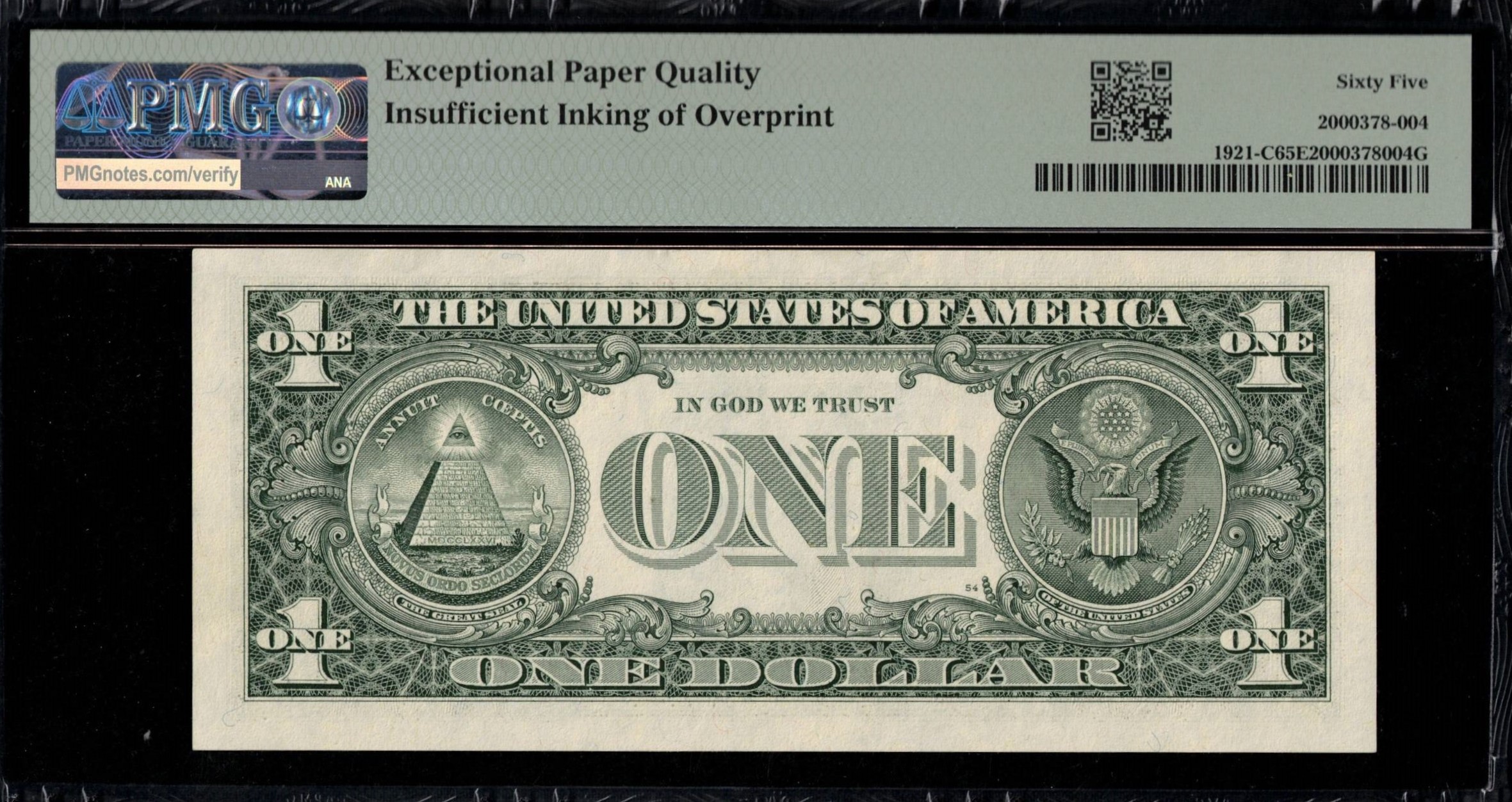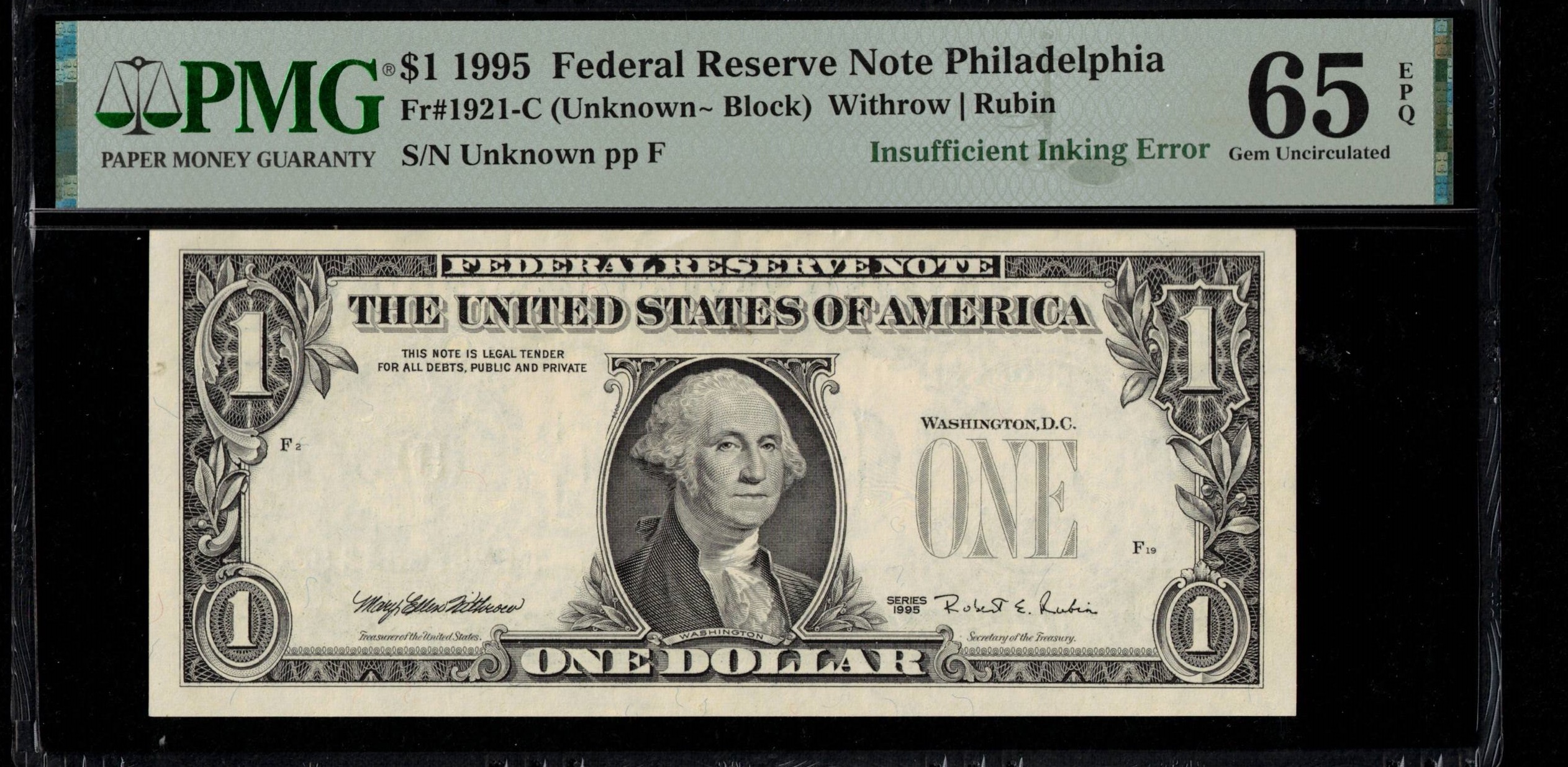 Fr‑1921‑C — 1995 Series One Dollar Federal Reserve Note from the Philadelphia District. This striking error occurs when two sheets stick together, causing the overprint to hit the top sheet while the bottom sheet rides along, leaving strong embossing but no ink, with design elements fully pressed yet visually absent. The impression is so pronounced that the District indicator shows as a C for the Philadelphia District. As an early‑series 1995 issue, this note is exceptionally well‑centered for a 32‑subject sheet and retains crisp originality throughout. Certified P.M.G. #65EPQ Gem Uncirculated, it boasts exceptional paper quality, bold embossing, and outstanding eye appeal—a scarce and highly desirable “lovely type” error note.