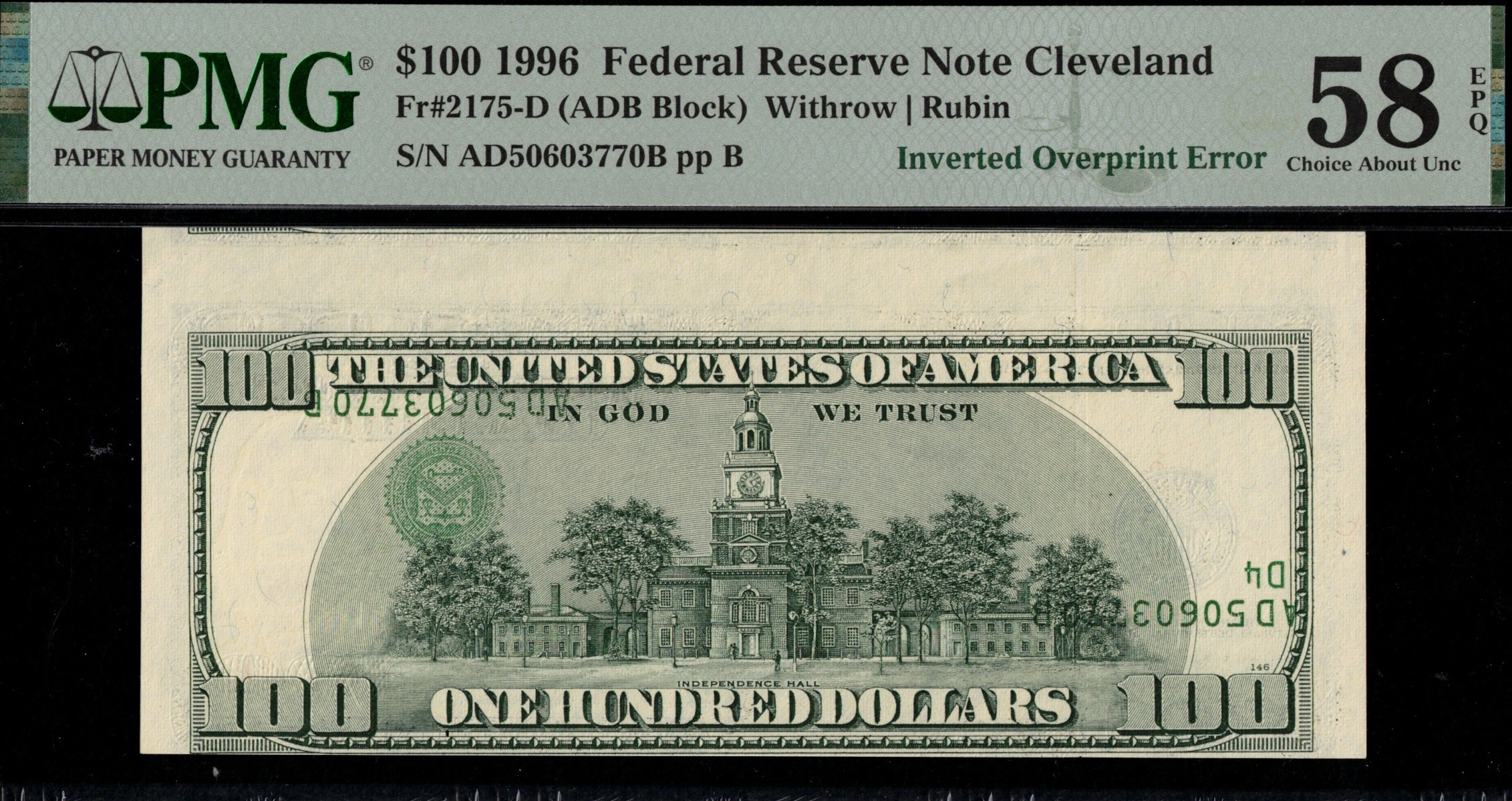Fr-2175-D 1996 Series One Hundred Dollar Federal Reserve note coming from the Cleveland District. Inverted overprint on the reverse of this First Generation Hundred. Flipped 180 Degrees onto the back of this note. Much rarer than just having just an overprint on the reverse. Note has some handling to it, we do not see a center fold, just a corner fold. This is just a hair off from the Choice Uncirculated grade level. Third Party Graded P.C.G.S #58PPQ Choice About Uncirculated with Exceptional paper quality.