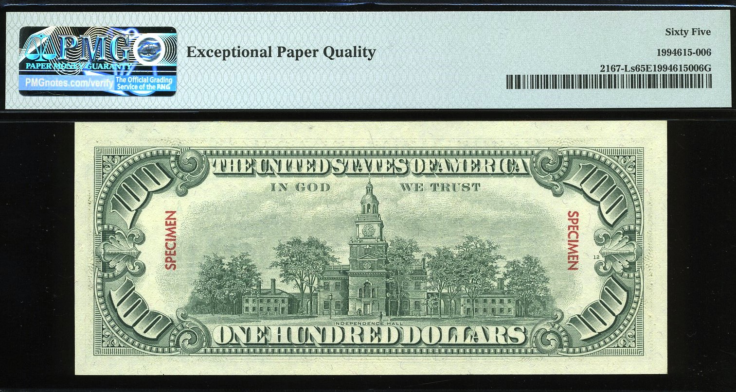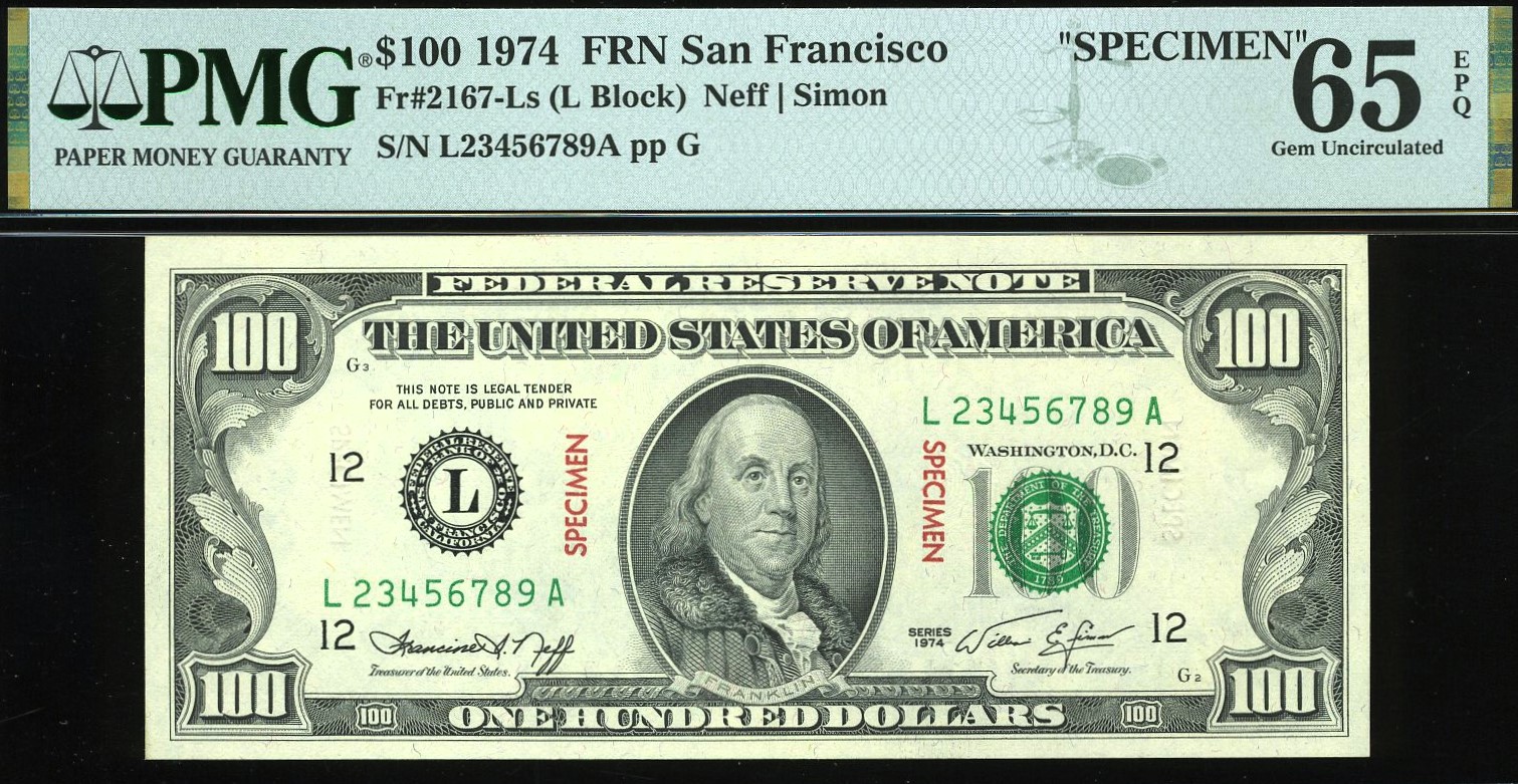 FR‑2167‑L — a 1974 Series $100 Federal Reserve Note issued from the San Francisco District, and an impressive example of a U.S. specimen note. These notes were produced for international reference, allowing other countries to examine U.S. currency prior to design or series changes.