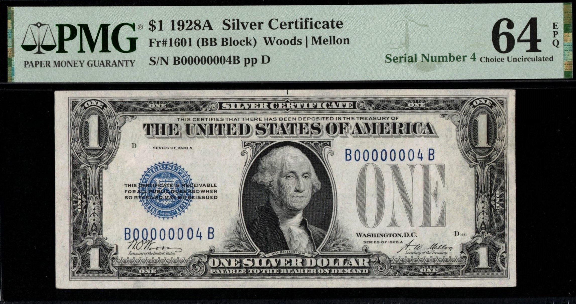 FR-1601 1928A Series One Dollar Silver Certificate with the single-digit serial number #4, B00000004B, cut from the first sheet of twelve printed for the 1928A Series. Features matching block letters B-B and graded by P.M.G. as #64EPQ Choice Uncirculated with exceptional paper quality. The overprint boasts wonderful color, the paper is bright, and it was stored for years before being placed in the P.M.G. holder. For single-digit collectors, nothing beats a FUNNY BACK from the very first sheet off the press.