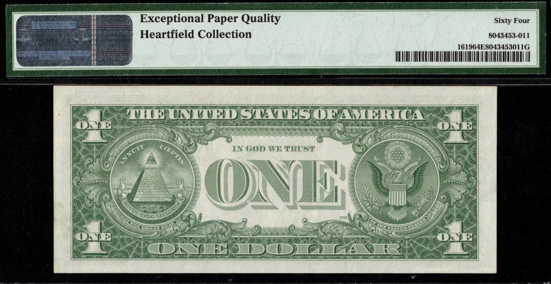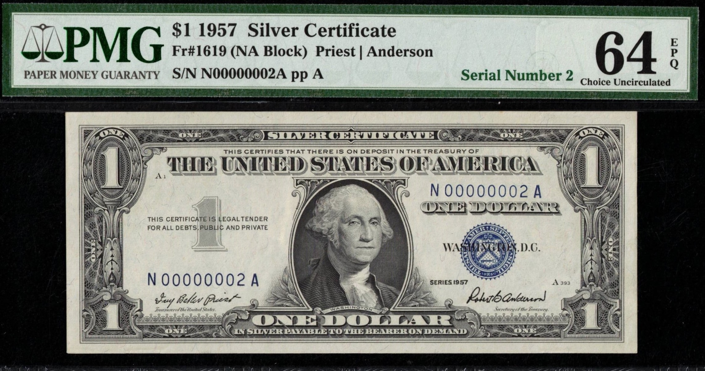 FR-1621 1957A Series One Dollar Silver Certificate with a rare single-digit serial number #2 (N00000002A), cut from the second sheet of 32 printed for the 1957A Series. Graded by P.M.G at #64EPQ Choice Uncirculated for its exceptional paper quality, it boasts wide margins, bright paper, and bold overprint inks. As the second note in this pack, it’s remarkable considering billions of silver certificates were printed—this one being among the very last low serial numbers from the 1928–1957B Series era of $1 Silvers. A truly fantastic piece!