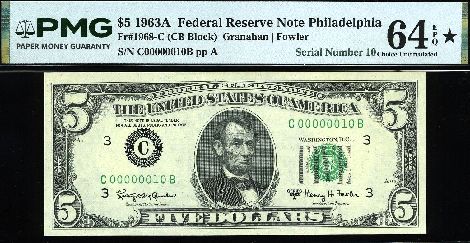 FR‑1968‑C 1963A $5 Federal Reserve Note, serial #10, PMG 64EPQ ★. First‑pack pull with exceptional paper quality and strong embossing.