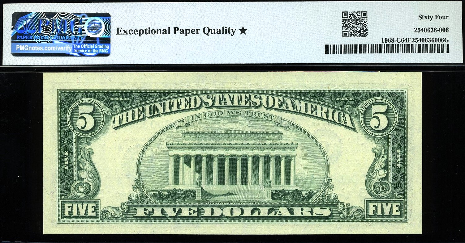 Certified PMG 64EPQ Choice Uncirculated, this example displays Exceptional Paper Quality, strong embossing, and crisp originality throughout. PMG awarded this note the Star Designation, recognizing its superior eye appeal and above‑average technical quality for the grade. The centering is solid, the detail is sharp, and the paper retains the pack‑fresh look expected from a note stored untouched for decades. Just two sit at this grade level, with just two higher.