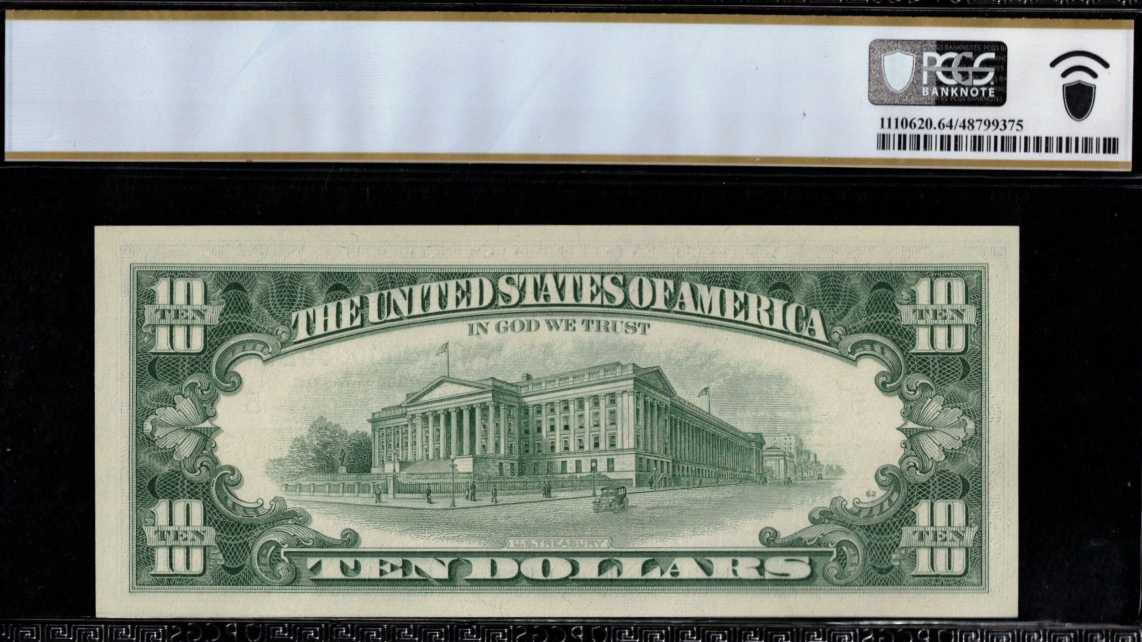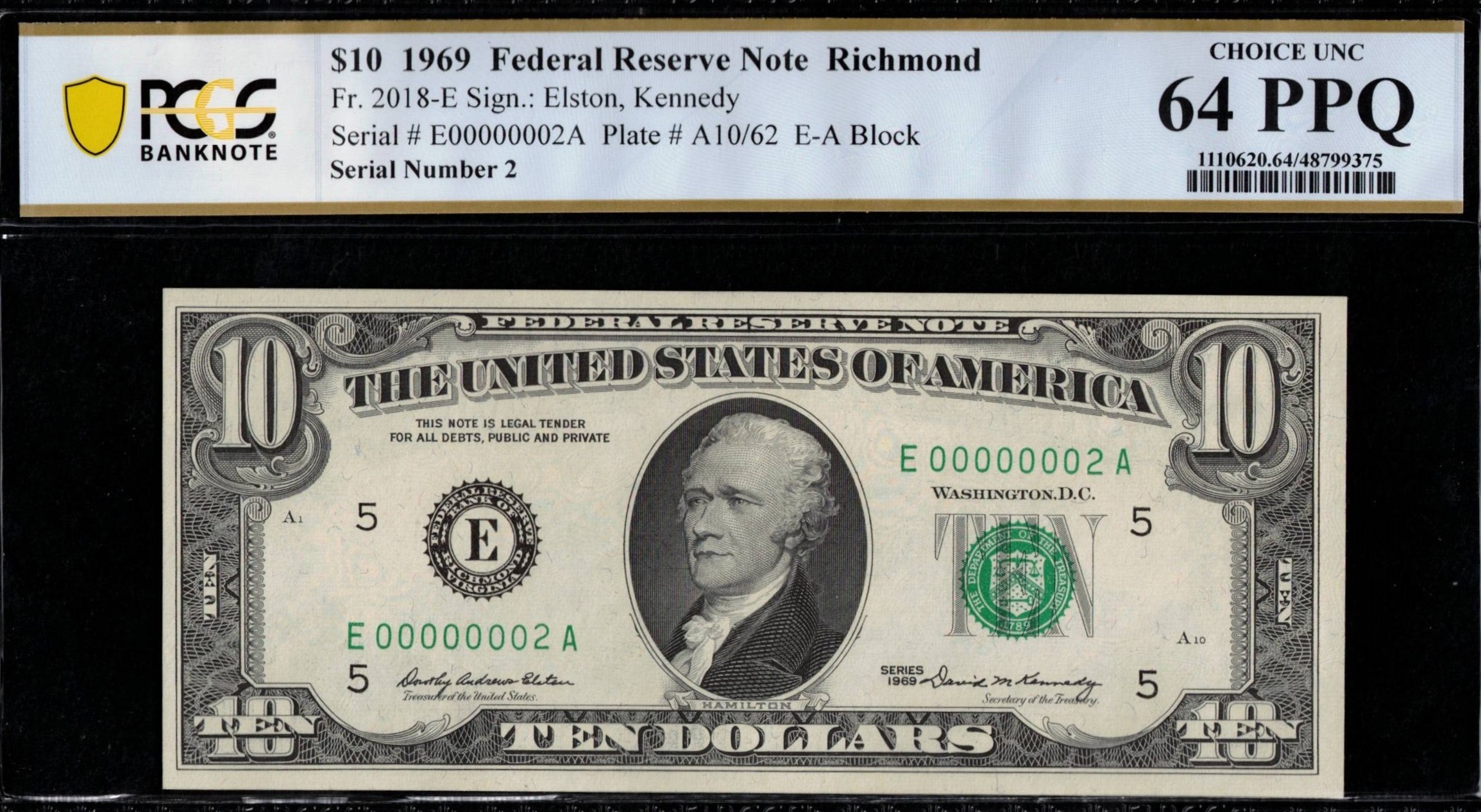 FR-2018-E 1969 Series Ten Dollar Federal Reserve note coming from the Richmond District. Single Digit #2……. From the second sheet printed, E00000002A. Third-party graded P.C.G.S #64PPQ Choice Uncirculated with premium paper quality. Out of the pack note, centered a bit off to call it a GEM. Otherwise, sharp corners, embossing, printed 50 plus years ago today. Small head designed ten with an ultra-low serial number. Short total print run for this block, E00000001A-E56960000A. Just a touch over 5 million notes.