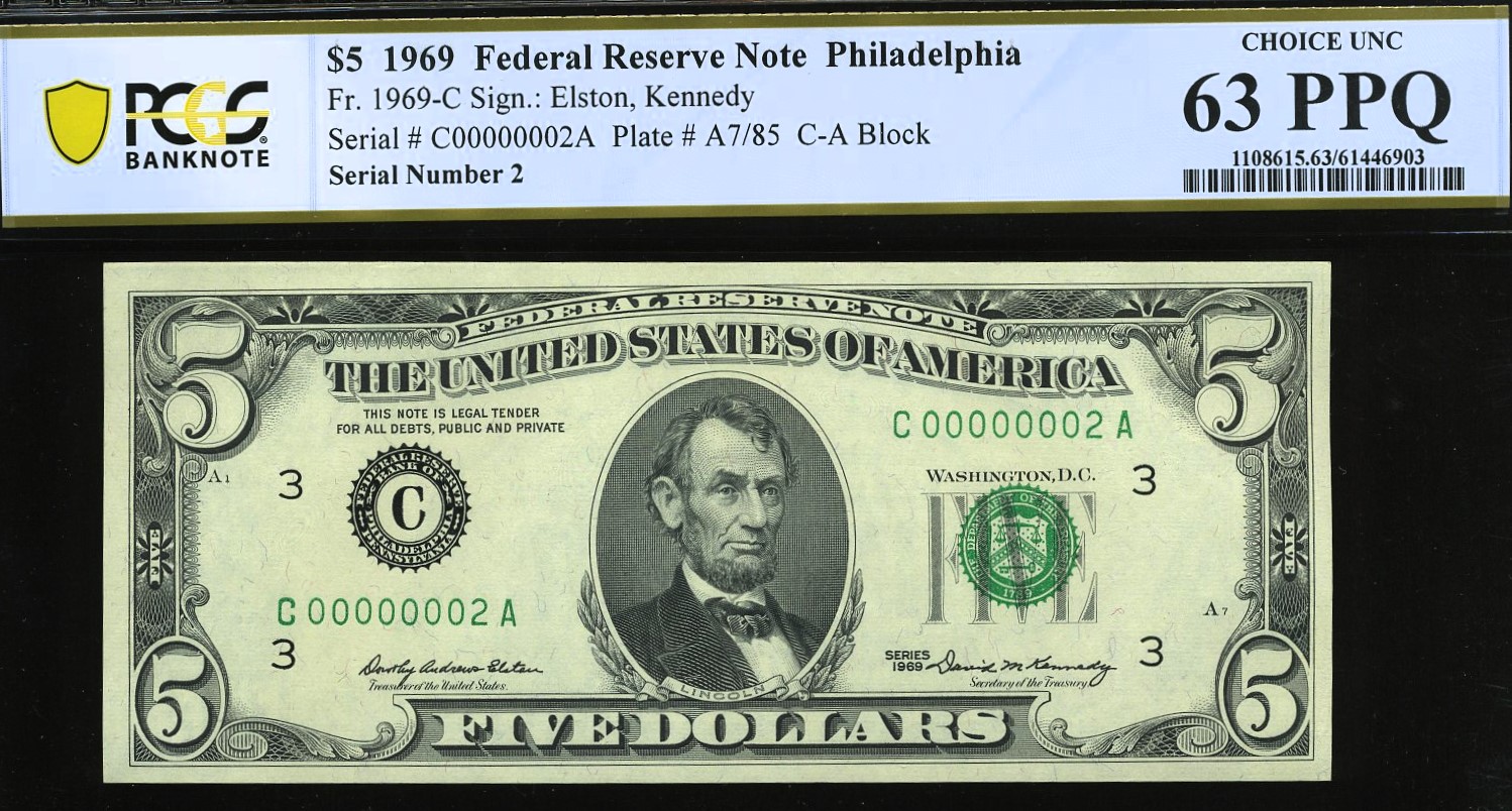 FR‑1969‑C — 1969 Series Five Dollar Federal Reserve Note from the Philadelphia District, carrying the exceptionally desirable single‑digit serial number #2. Bearing serial C00000002A, this note comes from the first block printed (C‑A) and was pulled from the first pack off the press, making it an early‑run modern rarity with undeniable collector appeal.