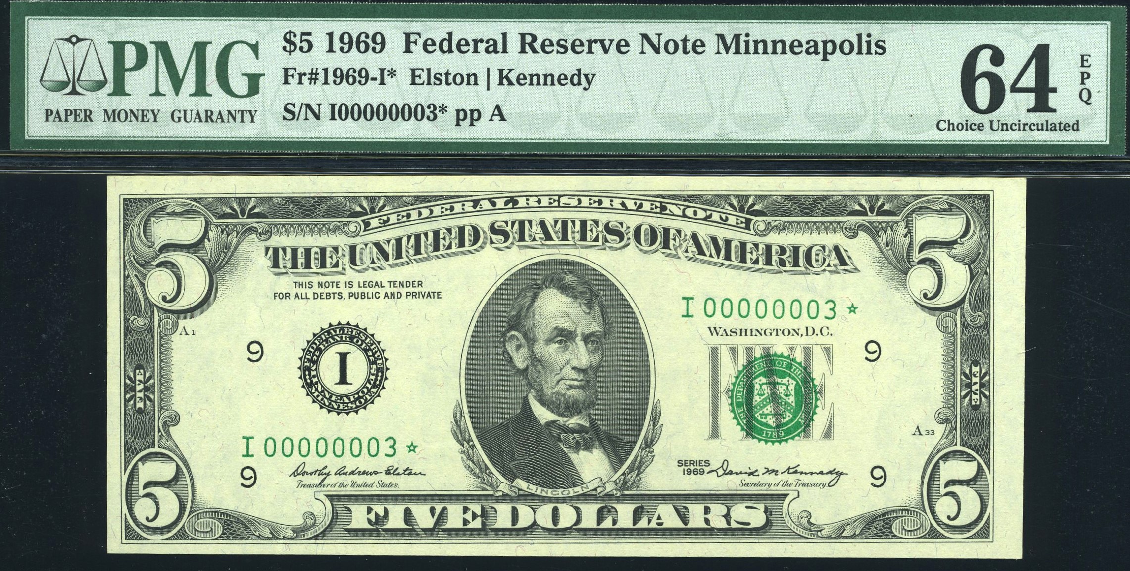 A truly elite early series rarity. This Minneapolis District replacement note carries an exceptionally early single‑digit star serial, I00000003*, placing it among the very first survivors of the print run. Certified P.M.G 64EPQ Choice Uncirculated, this note displays Exceptional Paper Quality, bold originality, and the crisp, pack‑fresh surfaces collectors expect at this level. Single‑digit star notes from the Minneapolis District are notoriously scarce and are tightly held in advanced collections. High‑grade examples seldom reach the open market, and when they do, they attract strong competition. This piece stands out as one of the finest early series $5 FRNs available, combining rarity, desirability, and exceptional eye appeal. A standout opportunity for collectors focused on low‑serial numbers, star notes, and high‑end modern Federal Reserve issues.