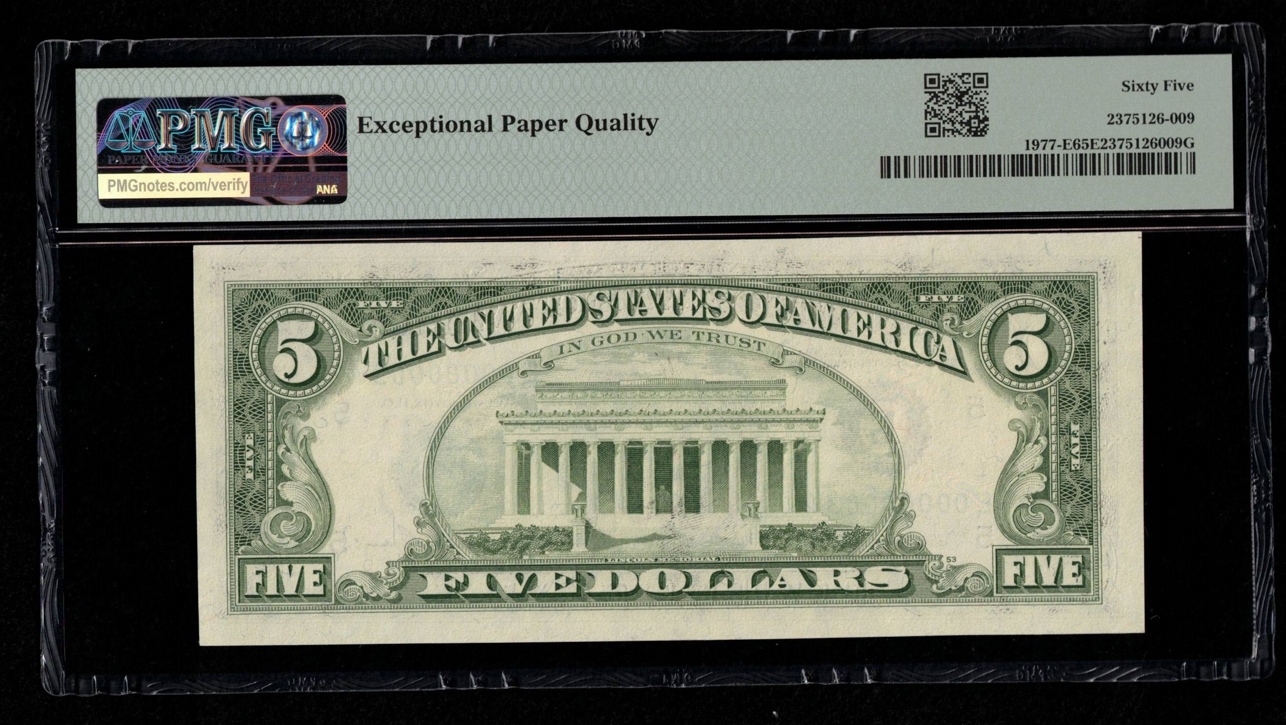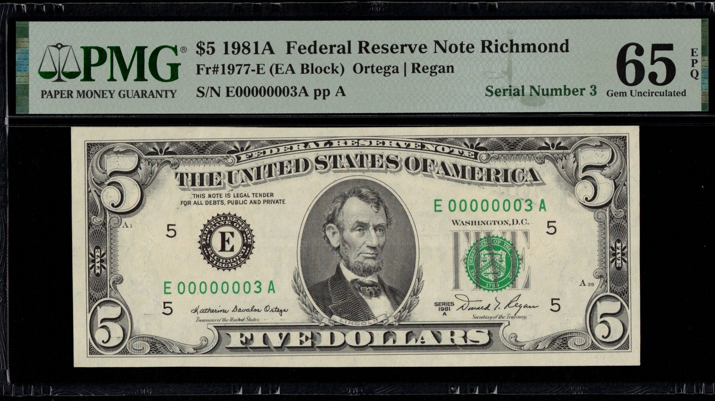 FR-1977-E 1981A Series Five Dollar Federal Reserve note from the Richmond District. Ultra-low serial number #3. E00000003A. First block “E-A” print run for this gorgeous-looking note that was third-party graded P.M.G #65EPQ Gem Uncirculated with exceptional paper quality. Razor sharp corners, embossing, and centered very well. A small head series that is no longer printed, on a popular collecting denomination. Just the E-A Block was printed for Richmond, E00000001A-E96000000A.