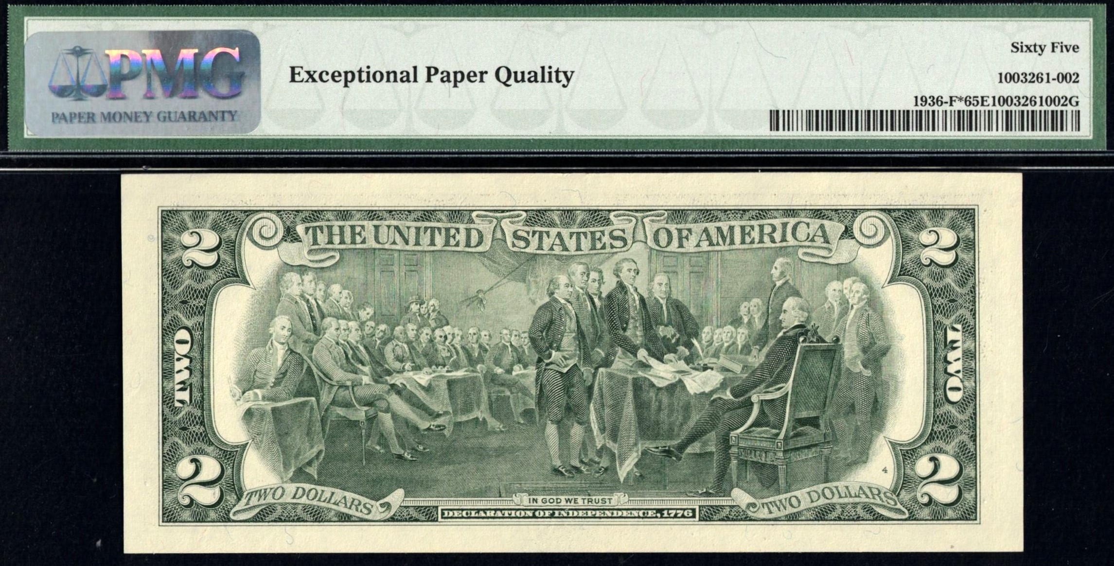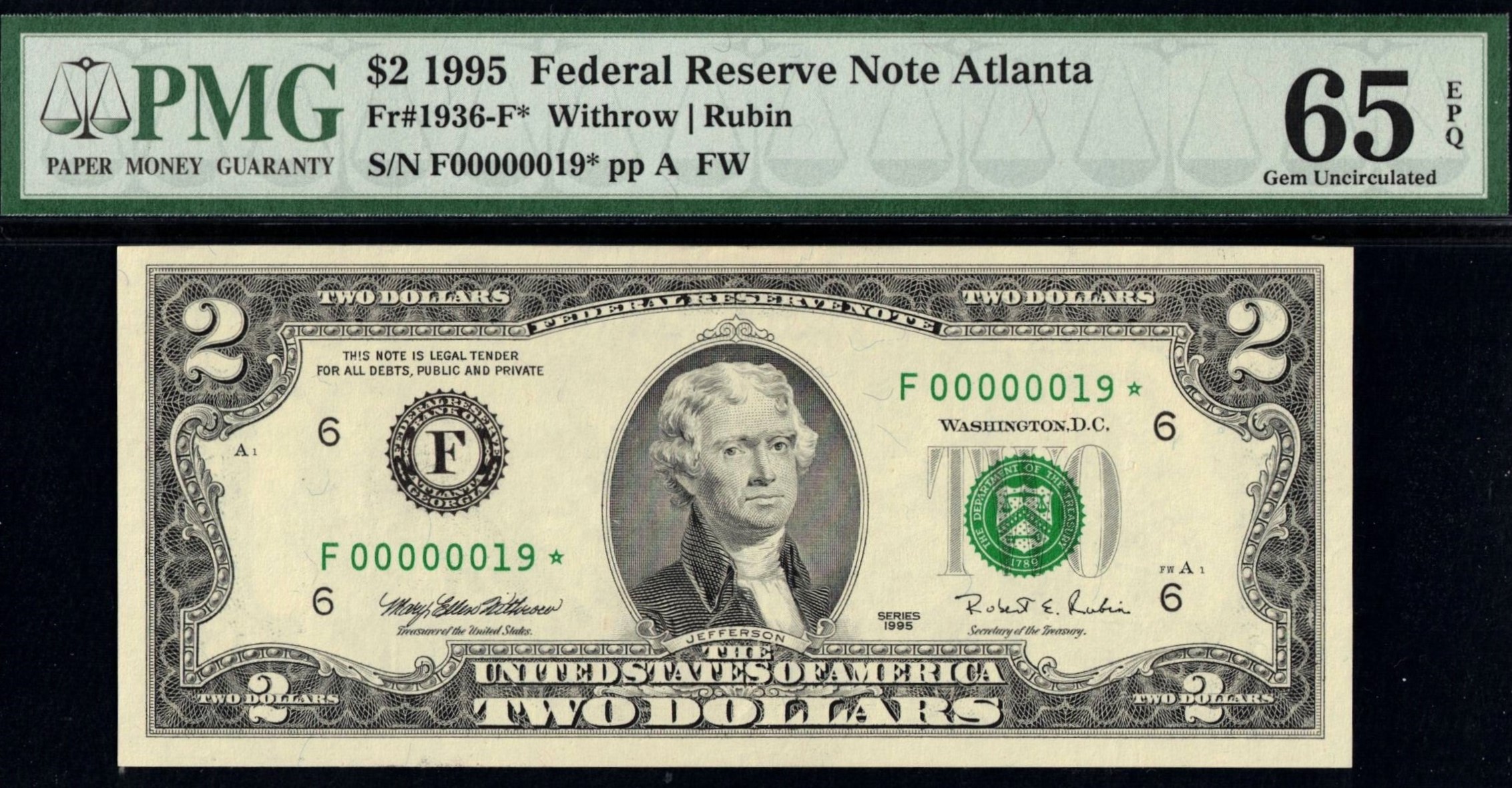Impressive FR‑1936‑F* — a 1995 Series $2 Federal Reserve Note from the Atlanta District, carrying the desirable low serial F00000019*. PLATE #4. The 1995 Series STARS are unique: Atlanta was the only district to receive star notes, with a modest 1.2 million printed. This example, serial number 19, comes from the earliest portion of that run — Graded PMG 65EPQ Gem Uncirculated, the note exhibits exceptional paper quality, strong originality, and excellent centering. Its sharp, pack‑fresh appearance places it among the finest early‑run stars from this scarce issue. Low‑serial star notes on the $2 denomination are notoriously difficult to locate, and examples this early in the sequence are tightly held. A standout opportunity for collectors pursuing modern rarities, low serial numbers, and premium‑grade $2 FRNs.