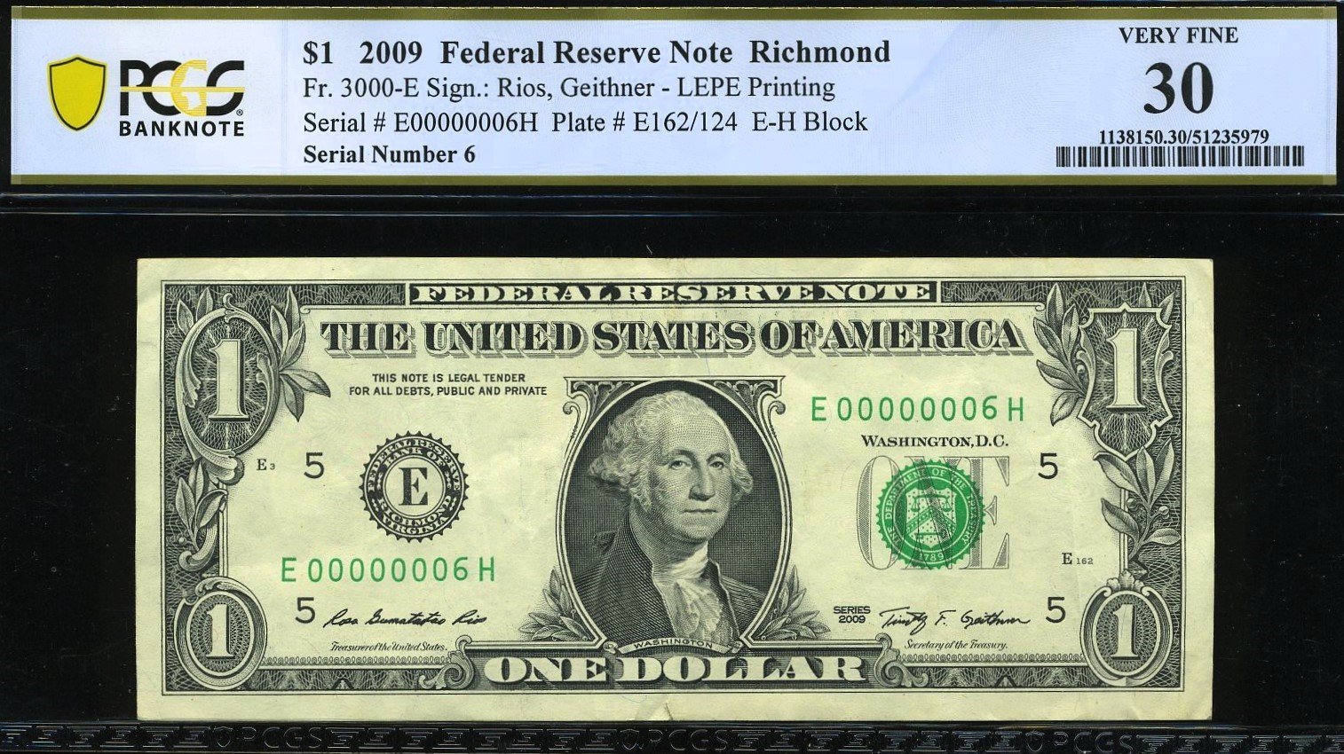 Richmond District • Single‑Digit Serial 00000006 • PCGS 30**