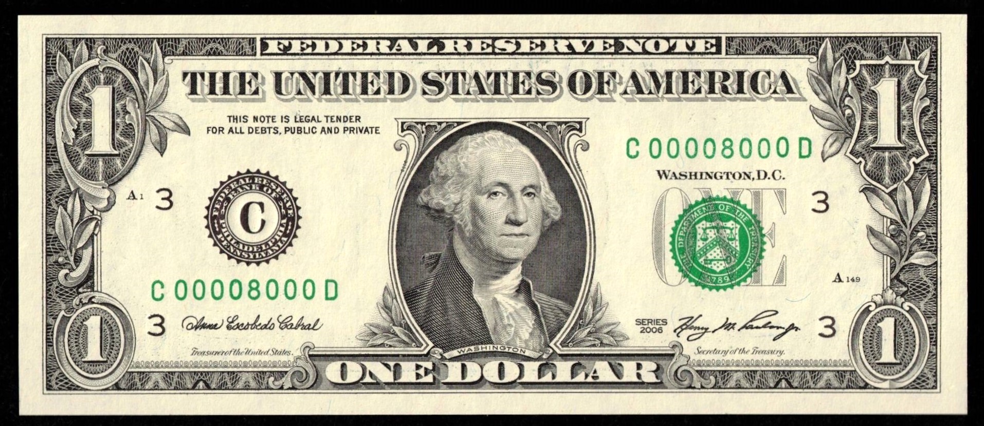 2006 Series One Dollar Federal Reserve note from the Philadelphia District with a binary even eight-thousand serial number, C00008000D. It’s well-centered with sharp overprint, bright white original paper, and is another Gem uncirculated note out of this batch. Great looking note with just the one digit showing.