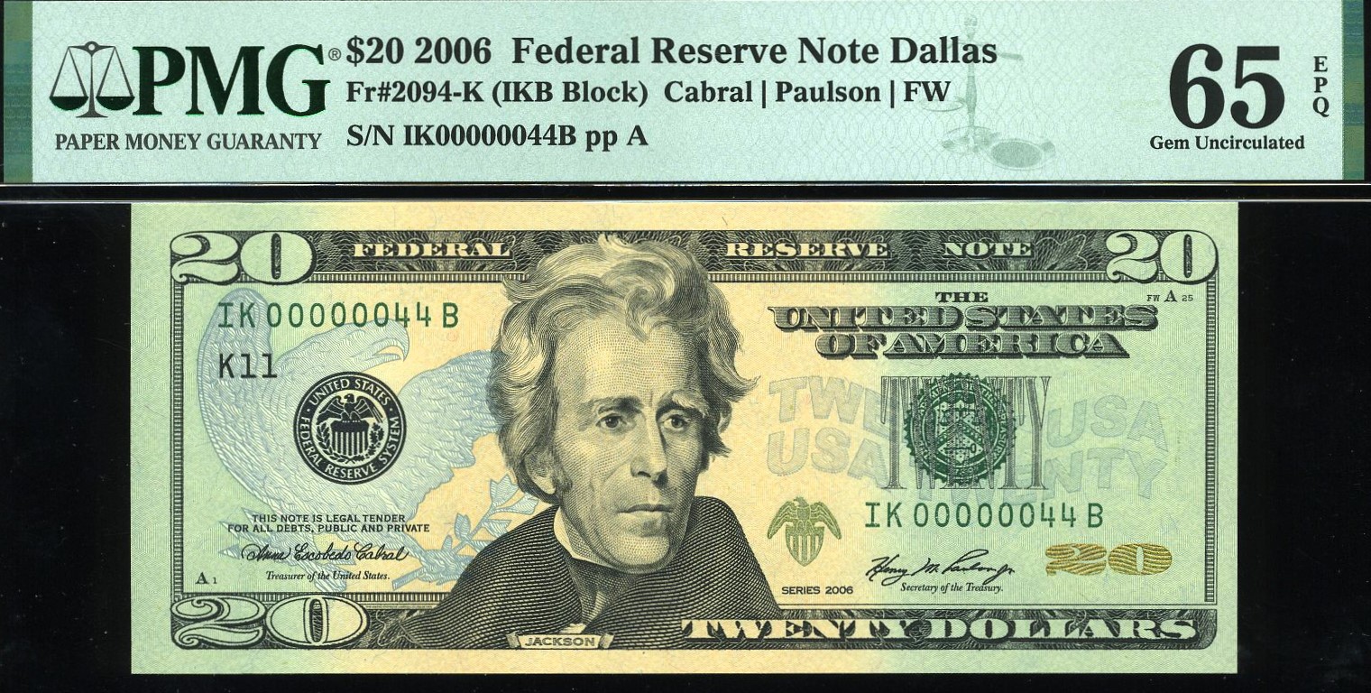 Presenting a standout modern rarity: a 2006 Series $20 Federal Reserve Note from the Dallas District, carrying the exceptionally desirable ultra‑low serial number IK00000044B. This two‑digit “44” example originates from the first pack printed, placing it among the earliest notes produced for this series and district.