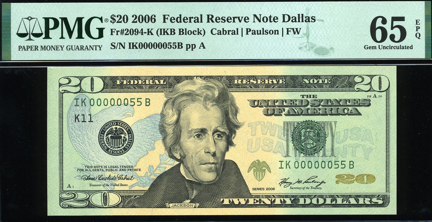 Presenting a standout modern rarity: a 2006 Series $20 Federal Reserve Note from the Dallas District, carrying the exceptionally desirable ultra‑low serial number IK00000055B. This two‑digit “55” example originates from the first pack printed, placing it among the earliest notes produced for this series and district.