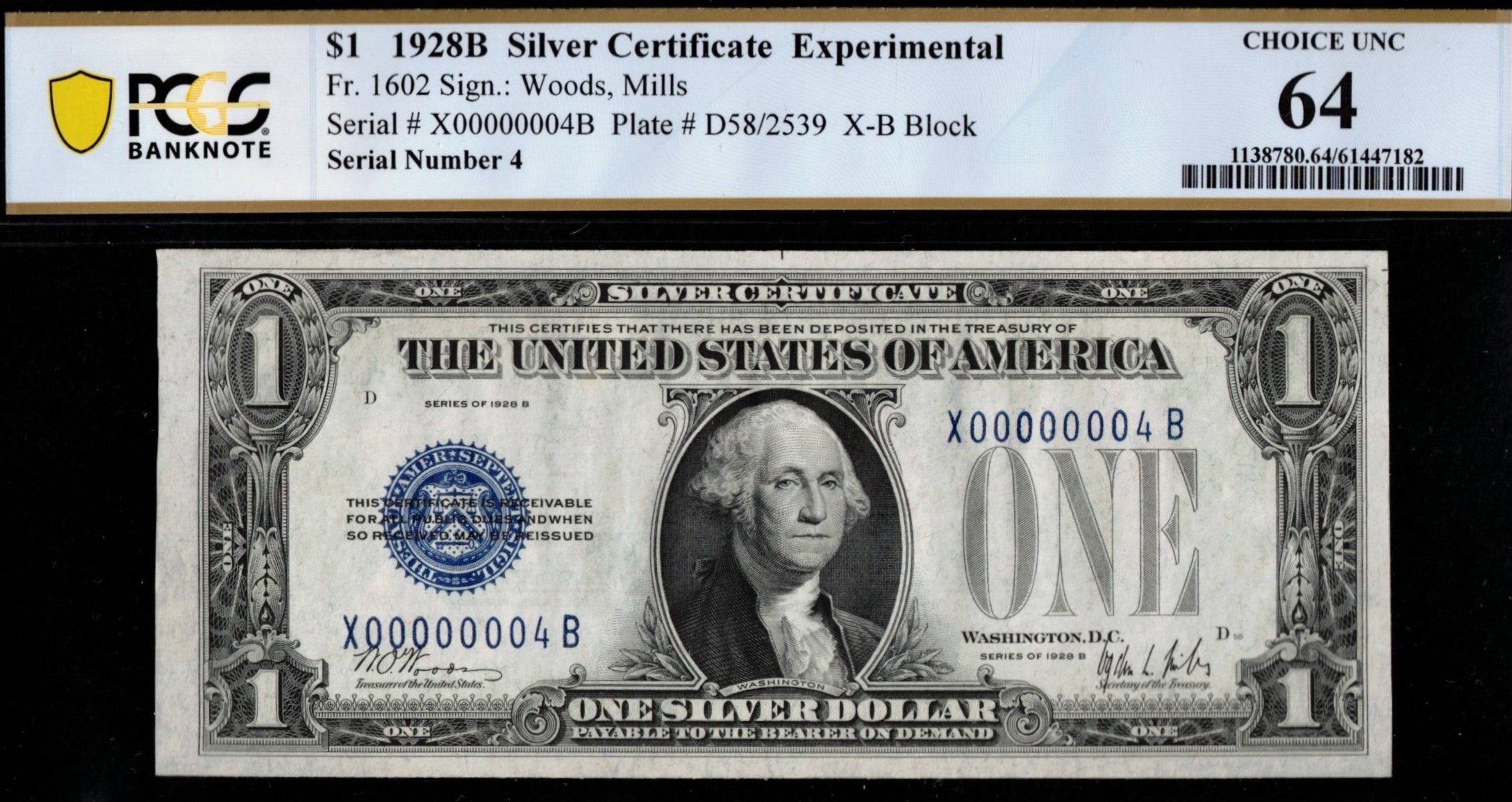FR-1602-1928B Series $1 Silver Certificate X00000004B P.C.G.S #64