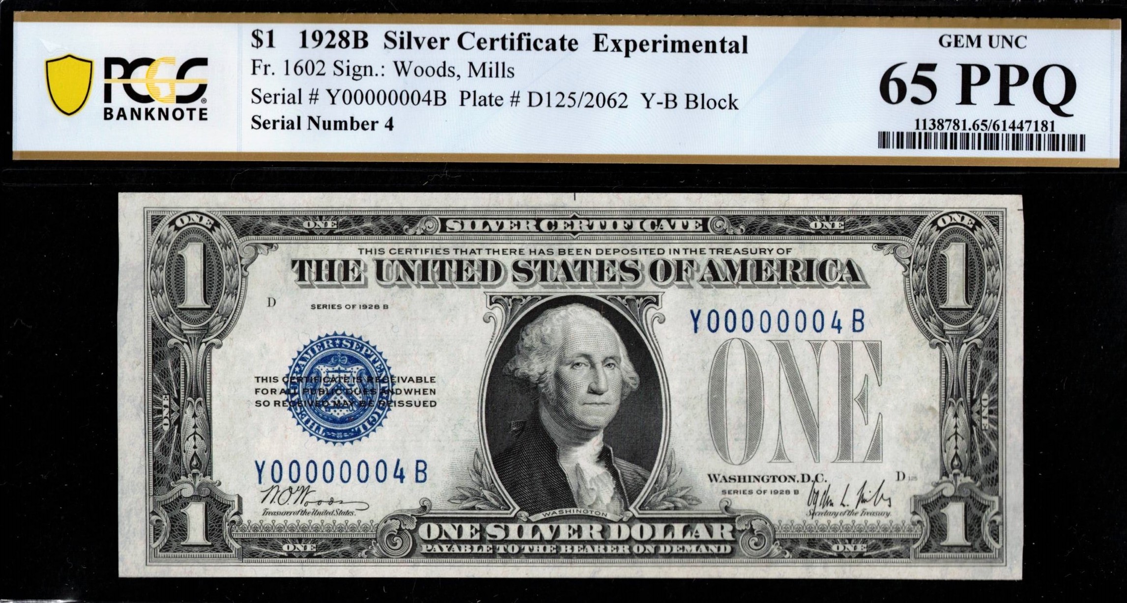 FR-1602-1928B Series $1 Silver Certificate Y00000004B P.C.G.S #65PPQ