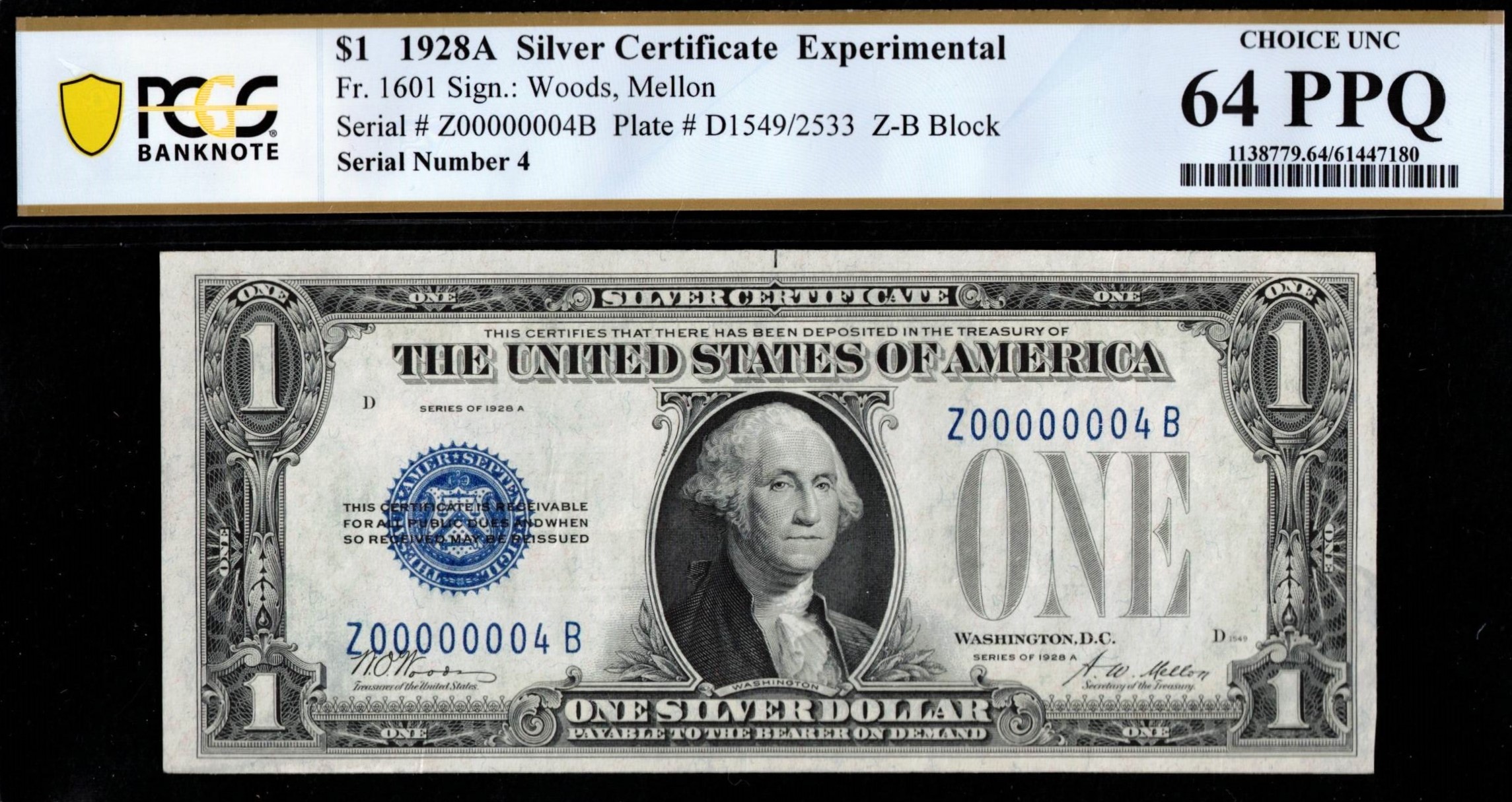 FR-1601-1928A Series $1 Silver Certificate Z00000004B P.C.G.S #64PPQ