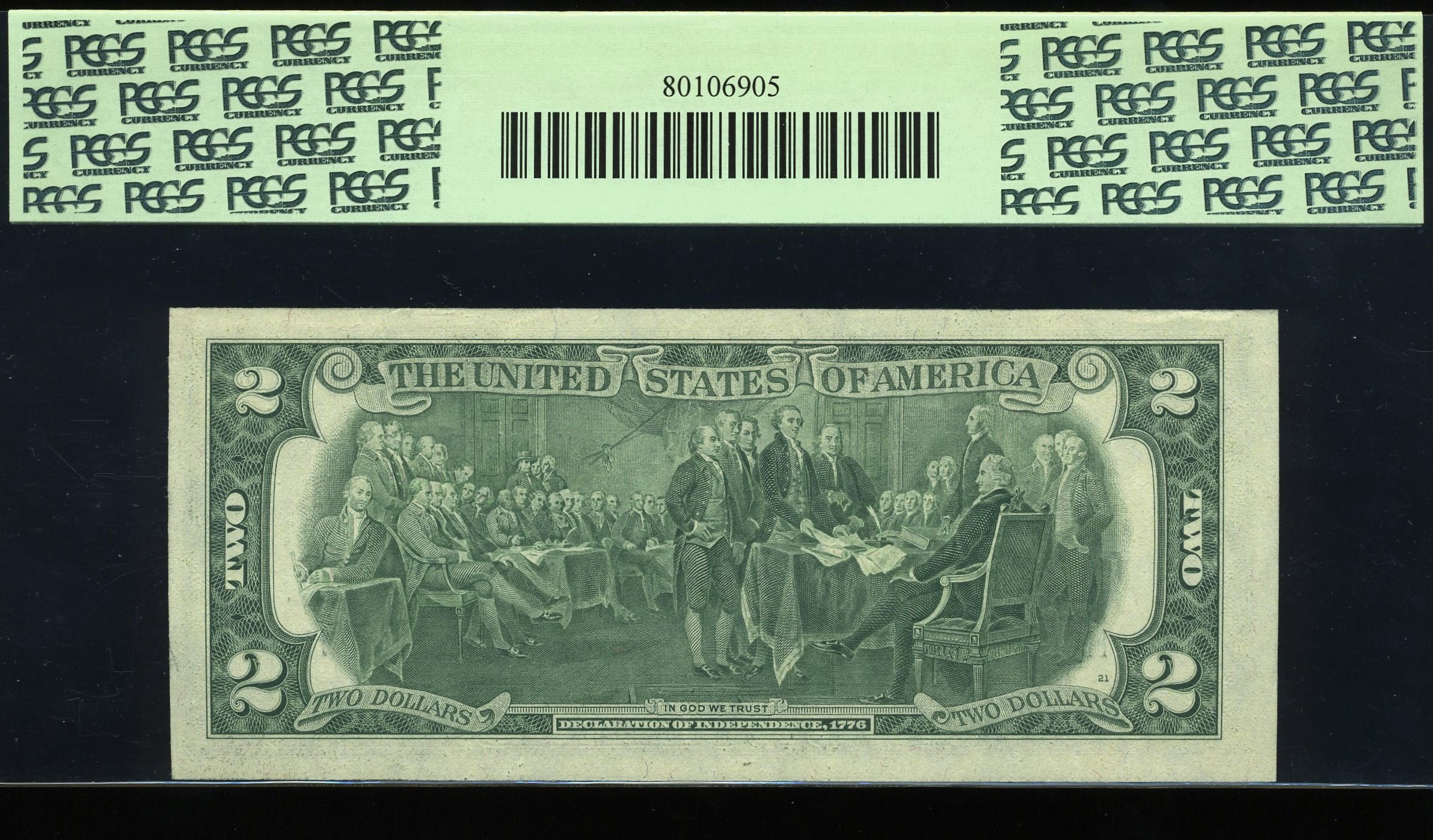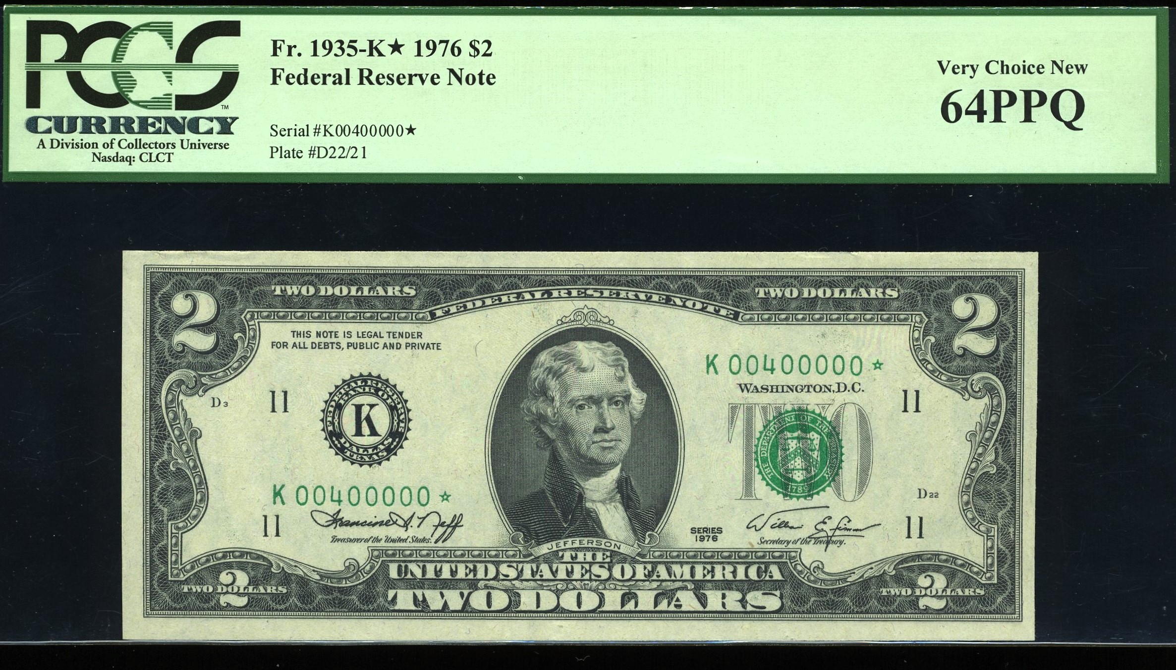 A tough and highly desirable 1976 Series $2 STAR note from the Dallas District, carrying the standout low serial K00400000*. This is the coveted “four‑hundred‑thousand star” position — a number that rarely surfaces, especially in premium third‑party holders. Certified PCGS 63PPQ Choice Uncirculated, this note shows premium paper quality, strong embossing, and respectable centering for the issue. It was the final note in its original pack, giving it the crisp, untouched look collectors expect from early‑run Bicentennial deuces. With seven leading zeros and a clean single‑digit finish, this serial has the visual punch and rarity profile that fancy‑number specialist’s chase.
