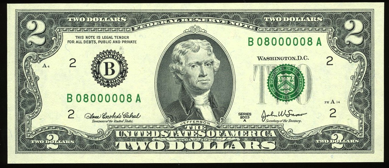 FR‑1937‑B — 2003A Series Two Dollar Federal Reserve Note (New York District) Carrying the striking binary serial B08000008A, this note features a perfect “eight‑million‑and‑eight” arrangement—an eye‑catching pattern built entirely from zeros and eights, two digits long favored by fancy‑serial collectors.