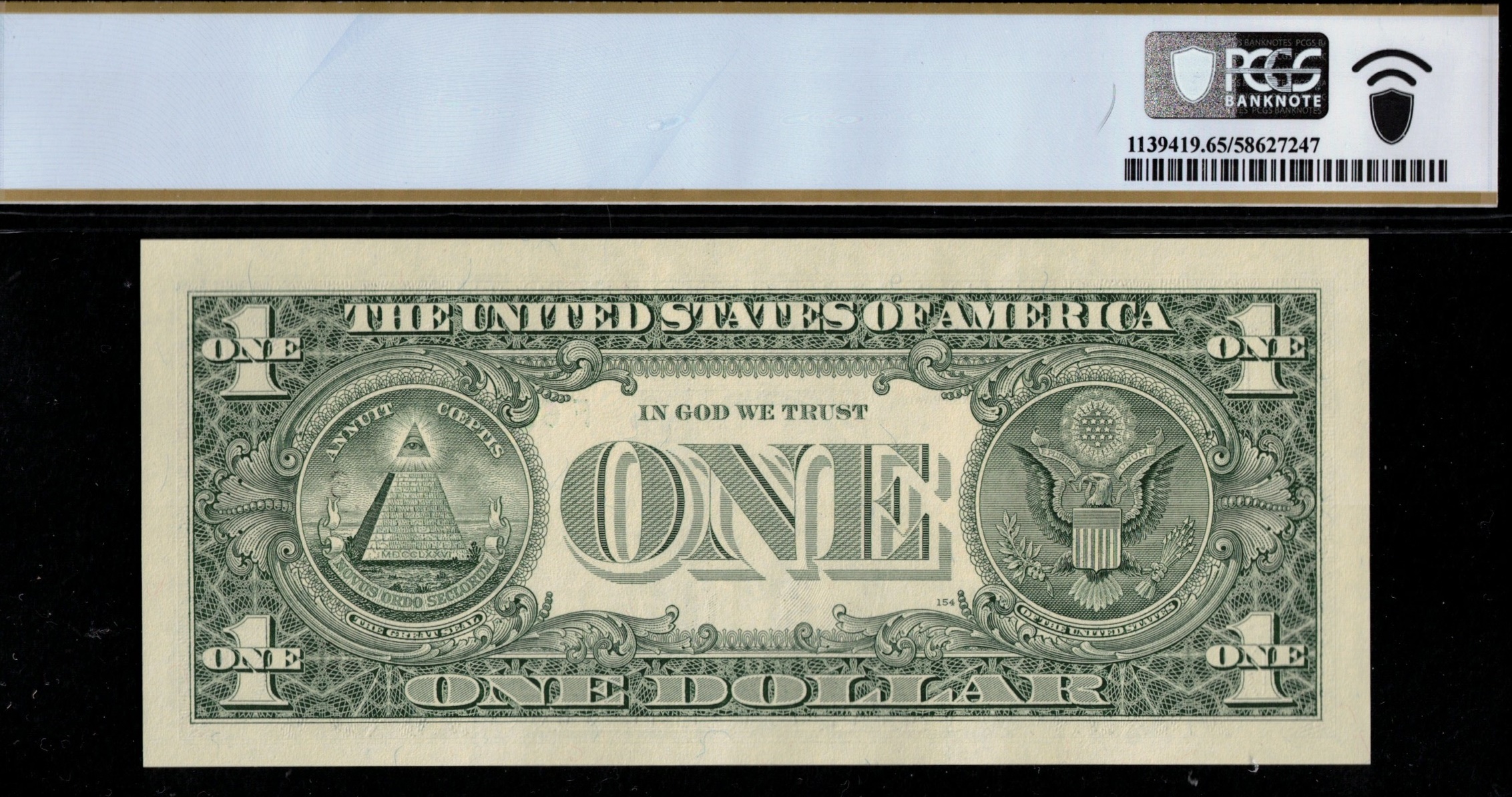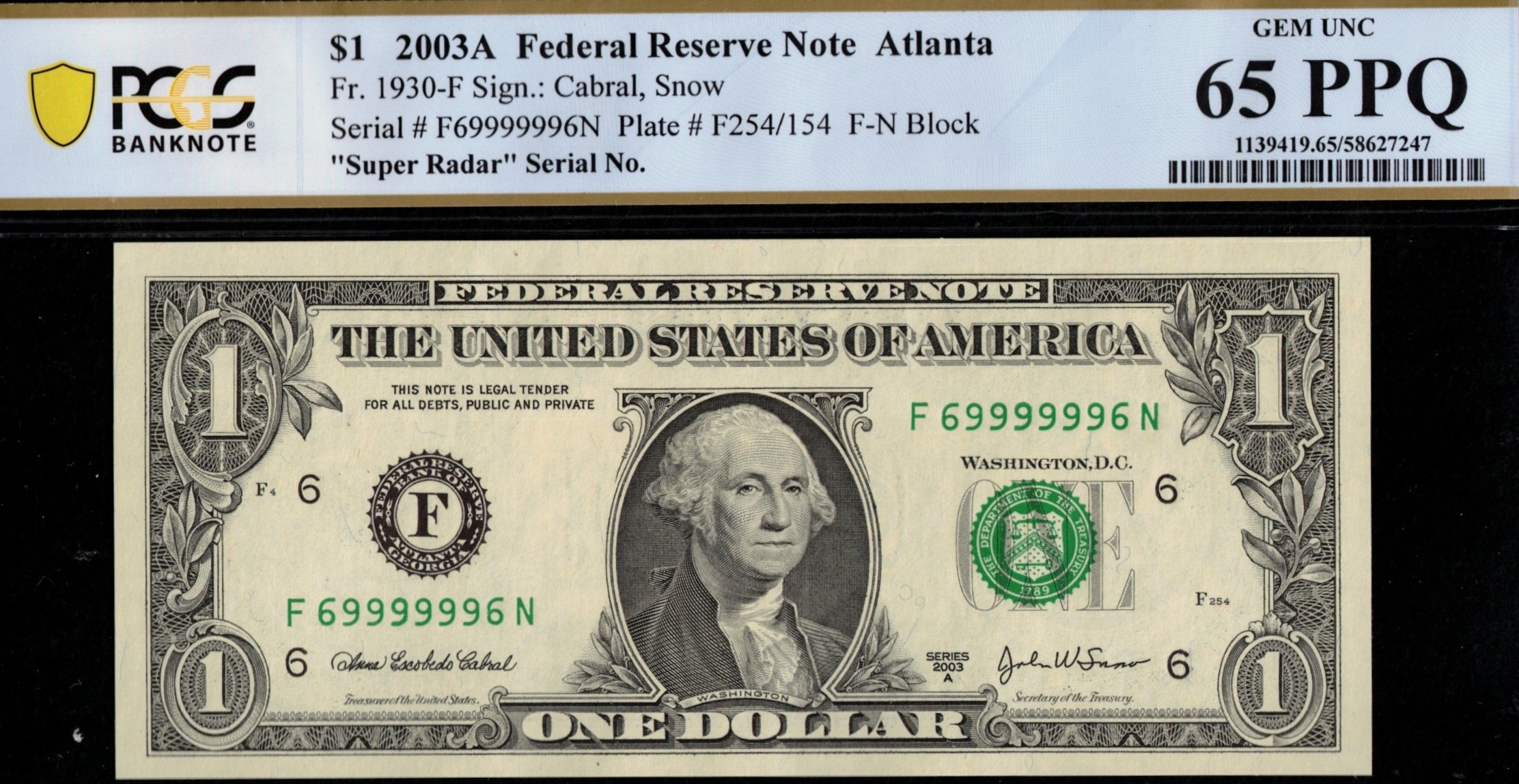 FR-1930-F 2003A Series One Dollar Federal Reserve note coming from the Atlanta District. A wonderful flipper serial number. F69999996N. Just SIXES AND NINES, making this one a popular serial number to collect. P.C.G.S #65PPQ Gem Uncirculated with premium paper quality. Great looking note.
