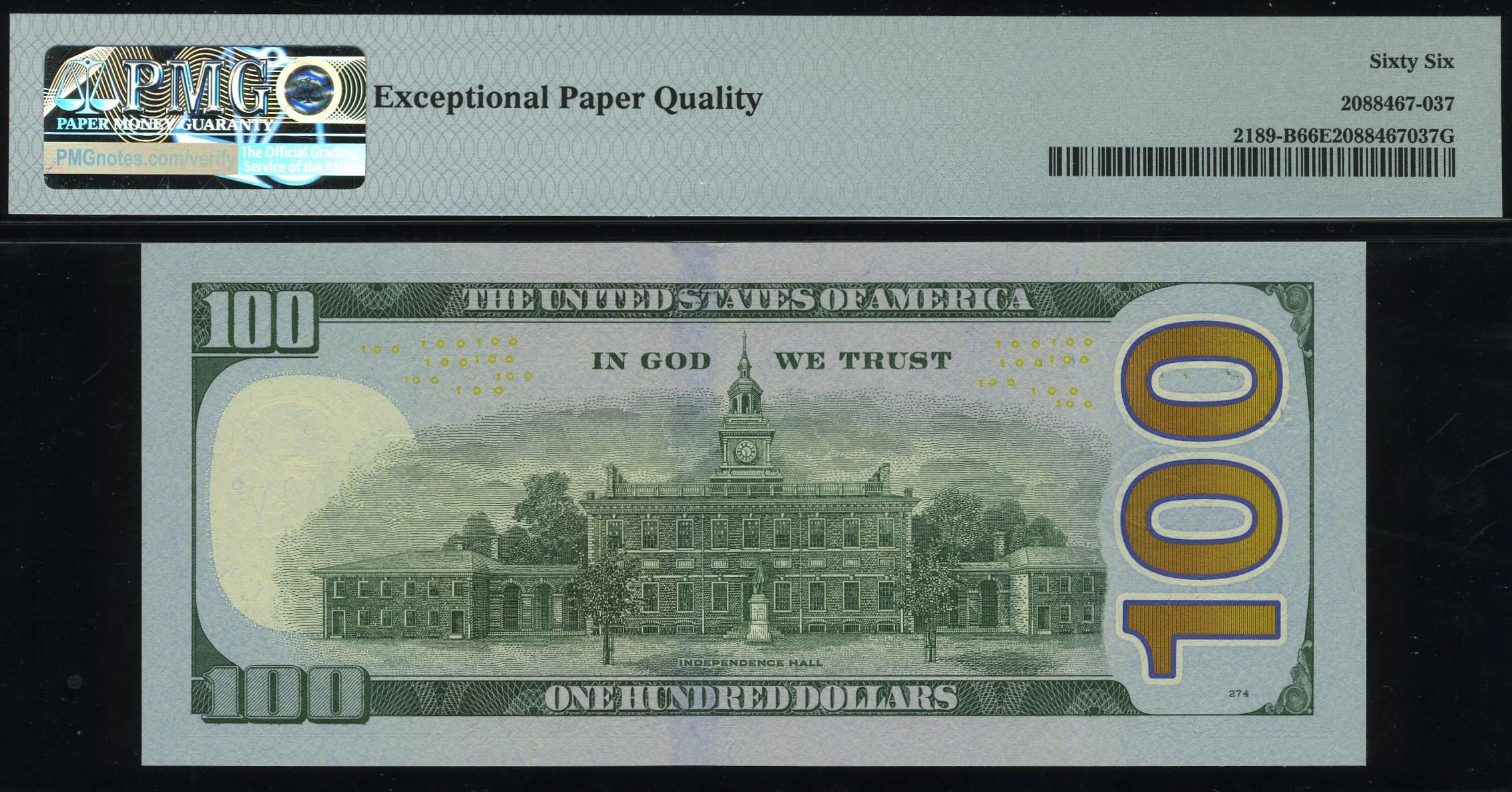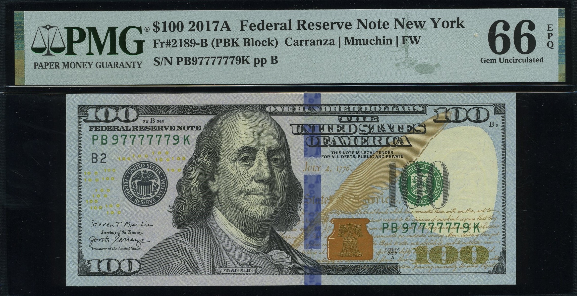 The Fr-2189-B 2017A Series One-Hundred-Dollar Federal Reserve note from the New York District, serial number PB97777779K, is graded by P.M.G. at #66EPQ. This Gem Uncirculated note boasts exceptional paper quality, is well-centered, and visually stunning. It features a high-serial-number super radar with a solid sequence framed by nines. For $50/$100 FRNs, the Bureau of Engraving and Printing’s LEPE press operations set the sequence at 99200000 when printed.