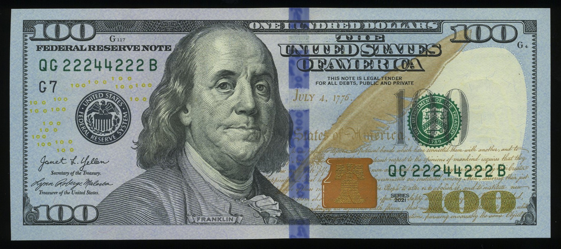 An impressive modern fancy‑serial $100 featuring the eye‑catching RADAR QG22244222B. This alternating rhythm gives the serial number exceptional visual appeal and places it squarely within the premium tier of collectible fancy numbers. Graded Gem Uncirculated, the note offers excellent centering, bold embossing, and crisp original paper surfaces. Each example was carefully pulled from freshly delivered bricks of new $100 notes, ensuring outstanding quality and originality. First offered at the recent Baltimore Coin & Currency Expo, we were able to secure only a few dozen of these standout fancy‑serial notes. A sharp, modern collectible that blends high denomination, premium condition, and a striking serial number.
