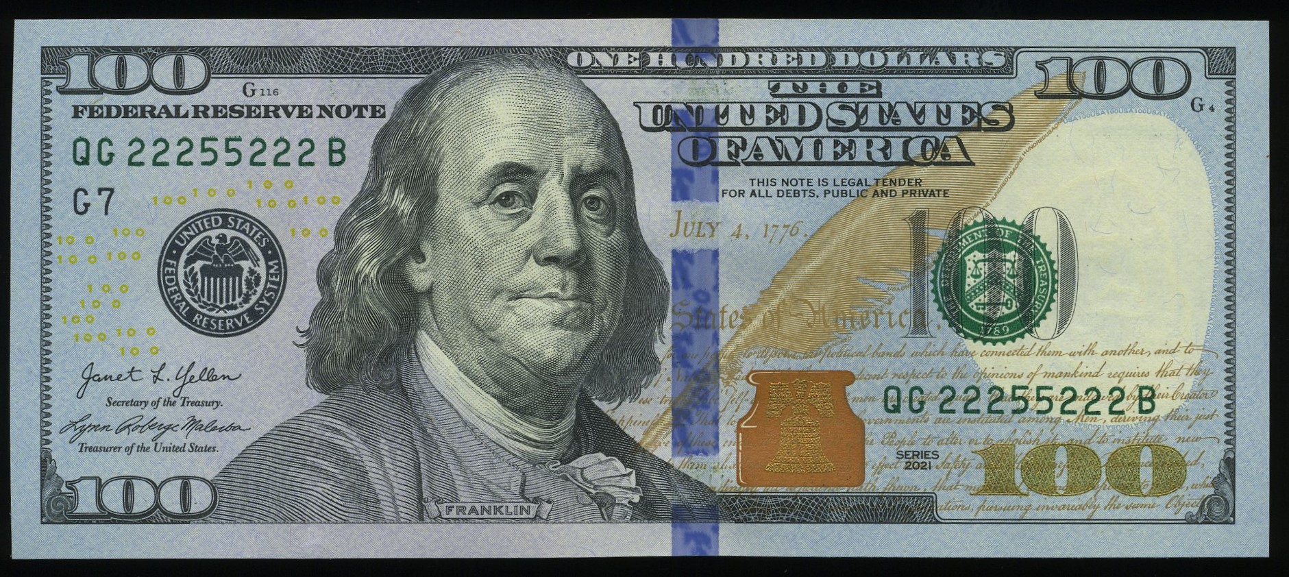 An impressive modern fancy‑serial $100 featuring the eye‑catching RADAR QG22255222B. This alternating rhythm gives the serial number exceptional visual appeal and places it squarely within the premium tier of collectible fancy numbers. Graded Gem Uncirculated, the note offers excellent centering, bold embossing, and crisp original paper surfaces. Each example was carefully pulled from freshly delivered bricks of new $100 notes, ensuring outstanding quality and originality. First offered at the recent Baltimore Coin & Currency Expo, we were able to secure only a few dozen of these standout fancy‑serial notes. A sharp, modern collectible that blends high denomination, premium condition, and a striking serial number.