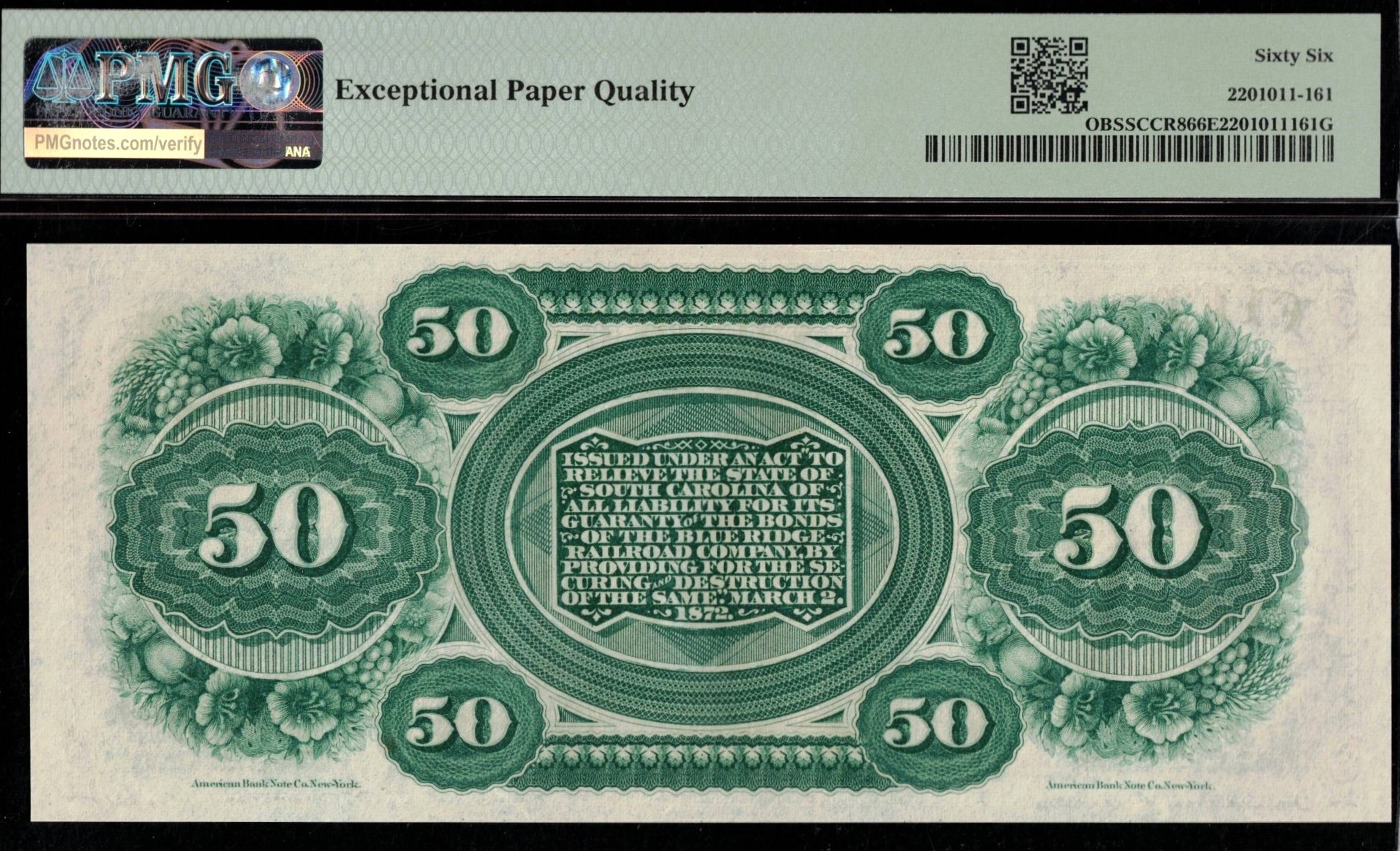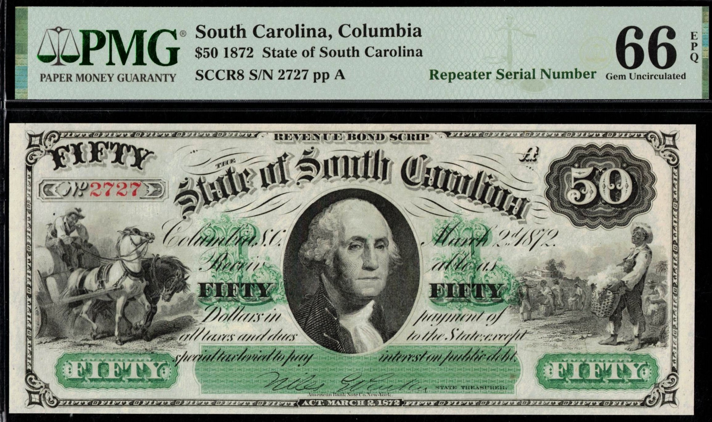 1872 State of South Carolina Obsolete Banknote. $50 Dollar Denomination SERIAL #2727 Repeater Serial Number. Third-party graded P.M.G #66EPQ Gem Uncirculated with exceptional paper quality. Very high grade with an excellent serial number, serial 2727, labeled on the P.M.G Holder.