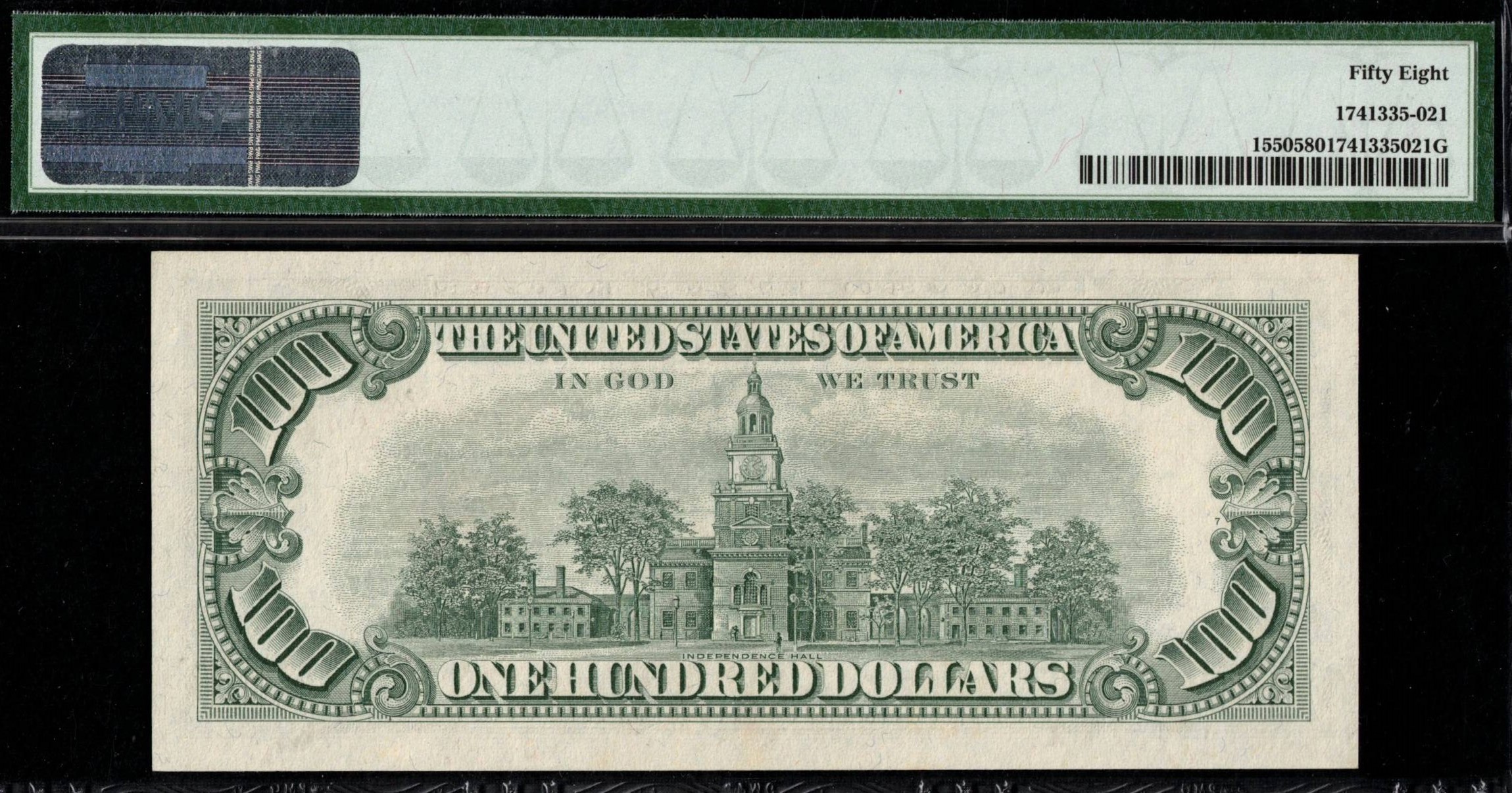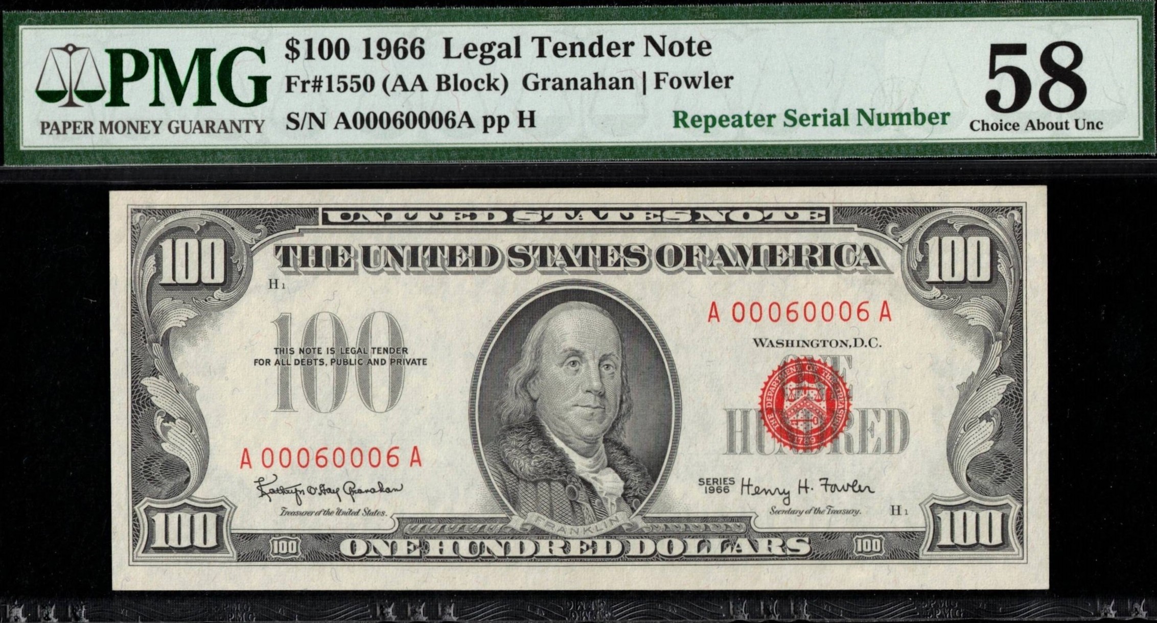FR-1550 1966 Series One Hundred Dollar Legal Tender with a two-digit repeater serial number A00060006A. This is the 6th repeater printed for the 1966 Series and one of only two two-digit repeaters found on $100 bills to date. Graded by a third party as P.M.G #58 Choice About Uncirculated, it features bright paper and sharp overprint. If you’re after the finale of legal tenders with an incredible repeater serial number, this is the one. 0-6’S.