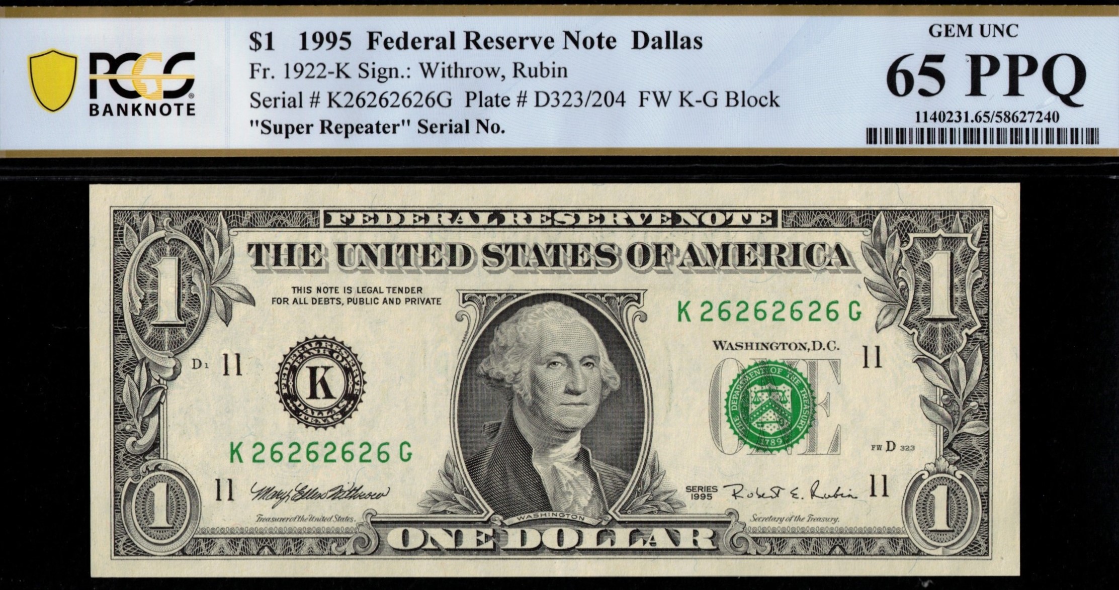 Fr-1922-K 1995 Series One Dollar Federal Reserve note from the Dallas District. The 26th true repeater serial from the block run. K26262626G. Third-party graded P.C.G.S #65PPQ Gem Uncirculated with premium paper quality. Out of the pack fresh……. Two-digit repeater serial number.