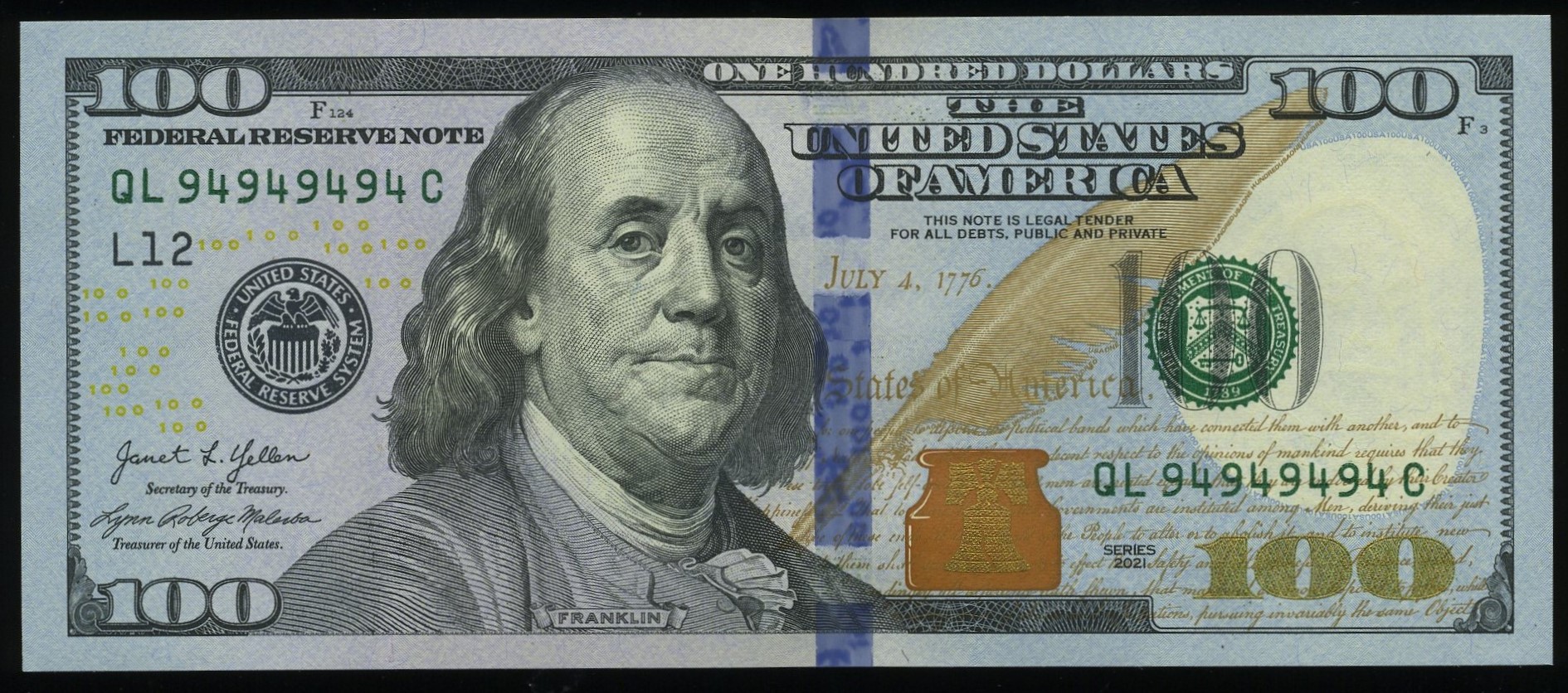 An impressive modern fancy‑serial $100 featuring the eye‑catching repeating pattern 94949494. This alternating rhythm gives the serial number exceptional visual appeal and places it squarely within the premium tier of collectible fancy numbers. Graded Gem Uncirculated, the note offers excellent centering, bold embossing, and crisp original paper surfaces. Each example was carefully pulled from freshly delivered bricks of new $100 notes, ensuring outstanding quality and originality. First offered at the recent Baltimore Coin & Currency Expo, we were able to secure only a few dozen of these standout fancy‑serial notes. A sharp, modern collectible that blends high denomination, premium condition, and a striking serial number.