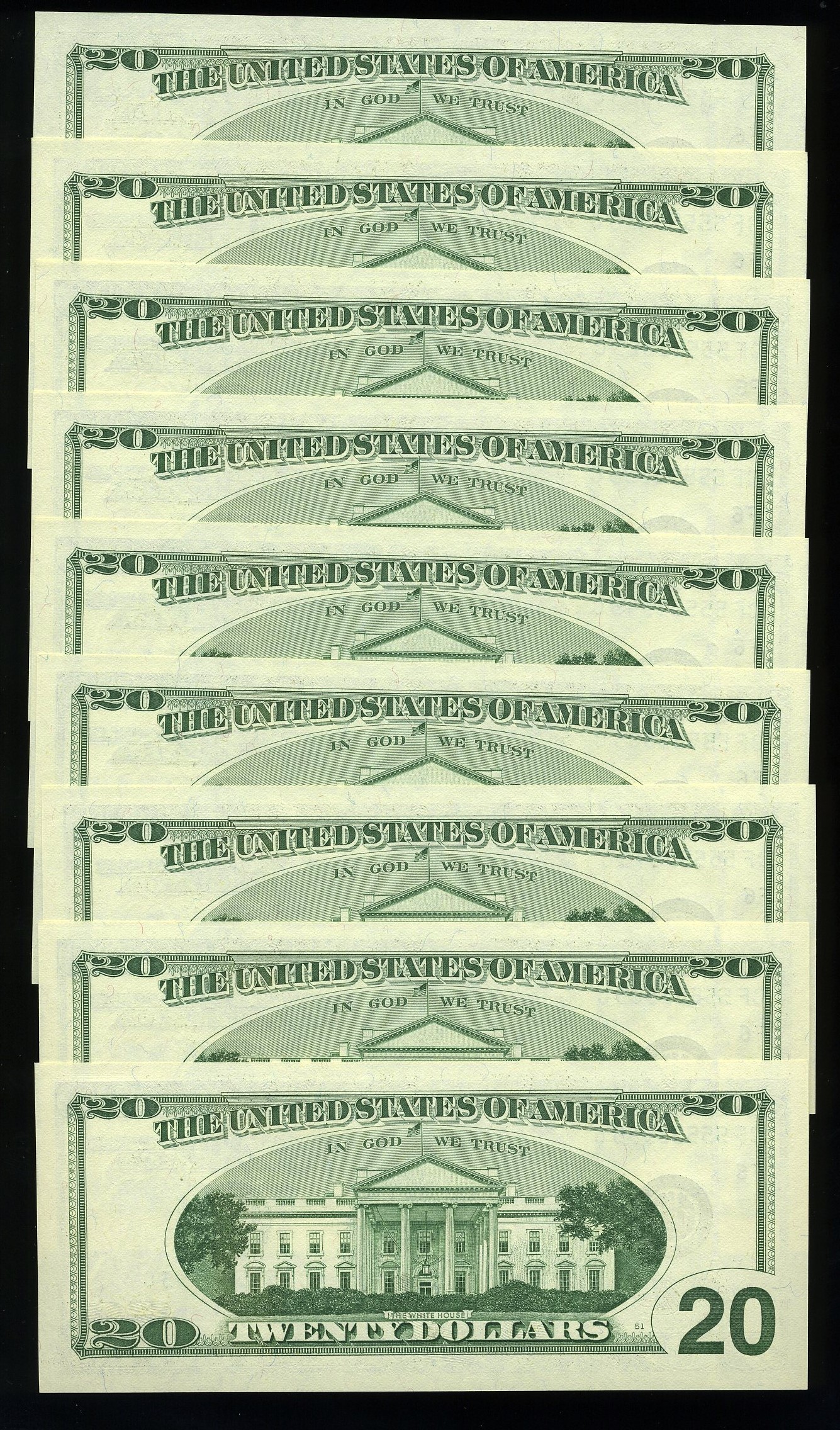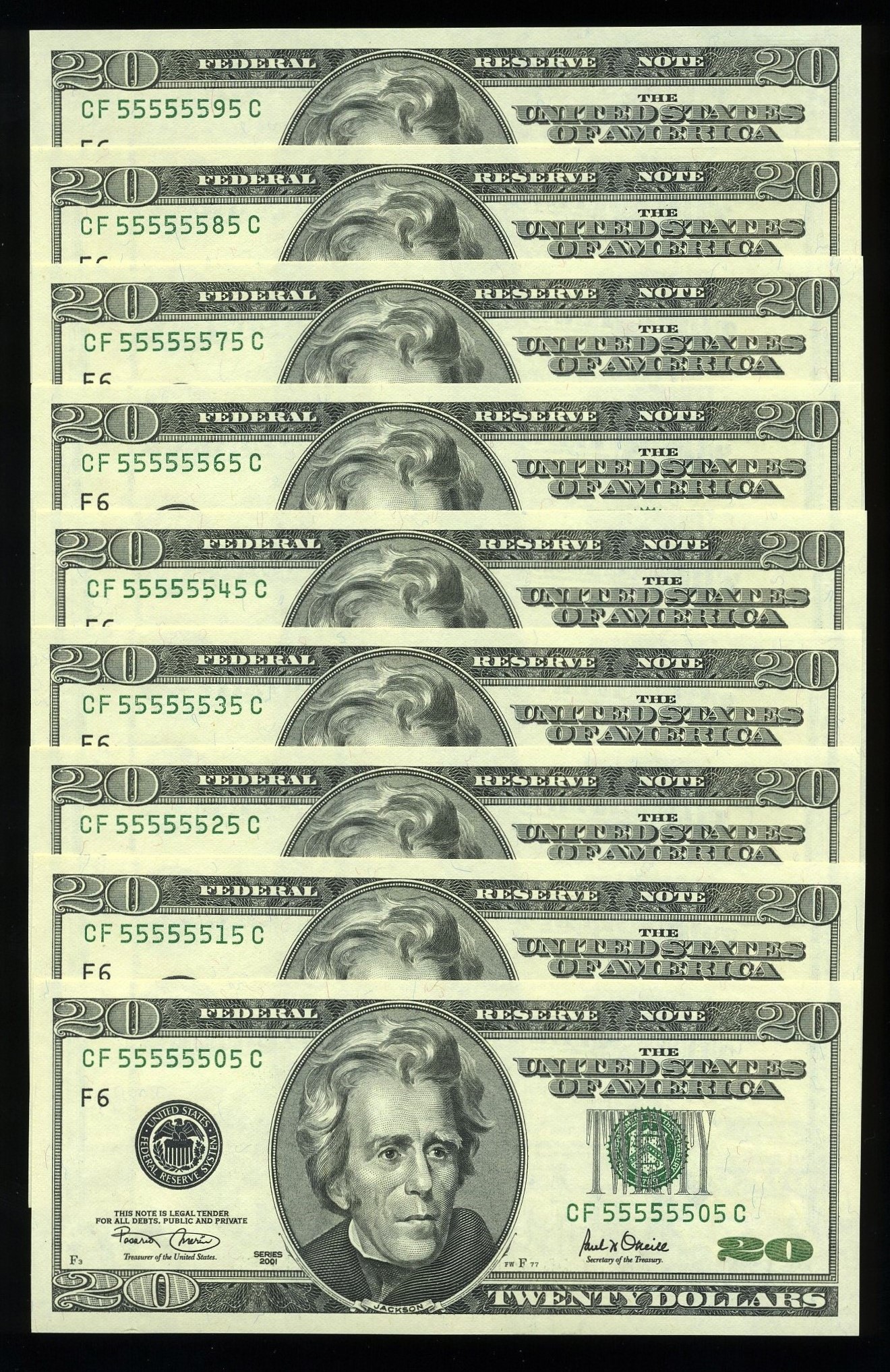 Nine‑note 2001 $20 Atlanta set featuring seven‑of‑a‑kind 5’s, all in Gem Uncirculated condition with excellent centering, crisp embossing, and bright original paper. This near‑solid fancy‑serial run includes nine matching notes pulled from the same pack as the solid (not included). A rare, high‑eye‑appeal group lot priced well below market for premium fancy numbers.