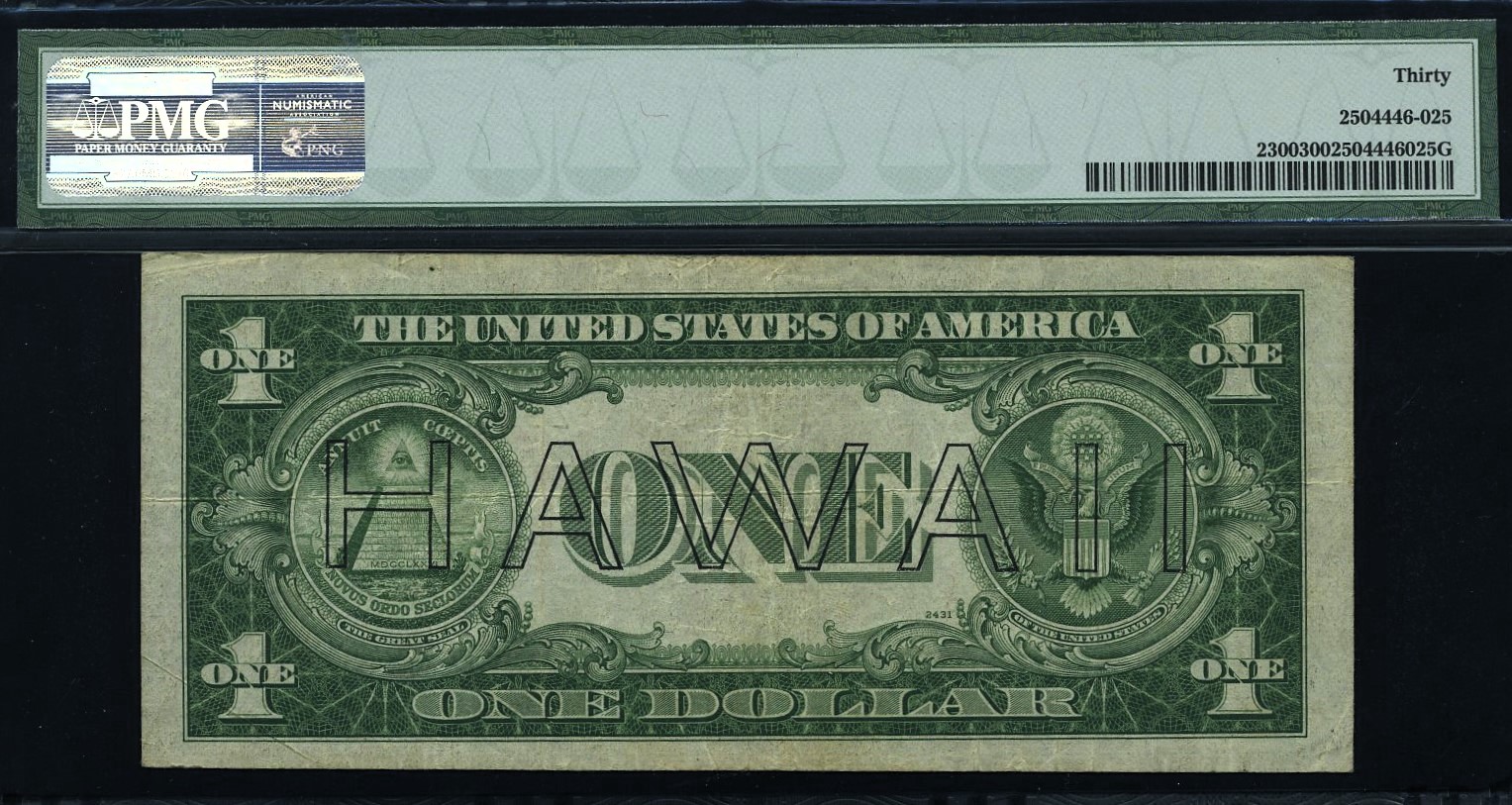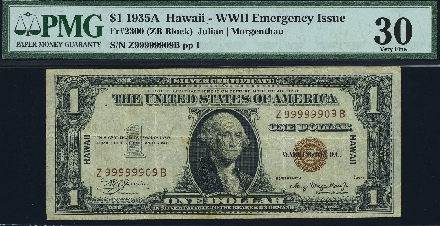 This near solid nines note is a scarce 1935A $1 Hawaii Emergency Silver Certificate. Serial Z99999909B with seven nines from the rare Z‑B block. Collectors rarely find a Hawaii note that qualifies as Almost perfect nines. On a $1.00. Graded PMG 30 with no comments, it offers strong eye appeal and wartime rarity.