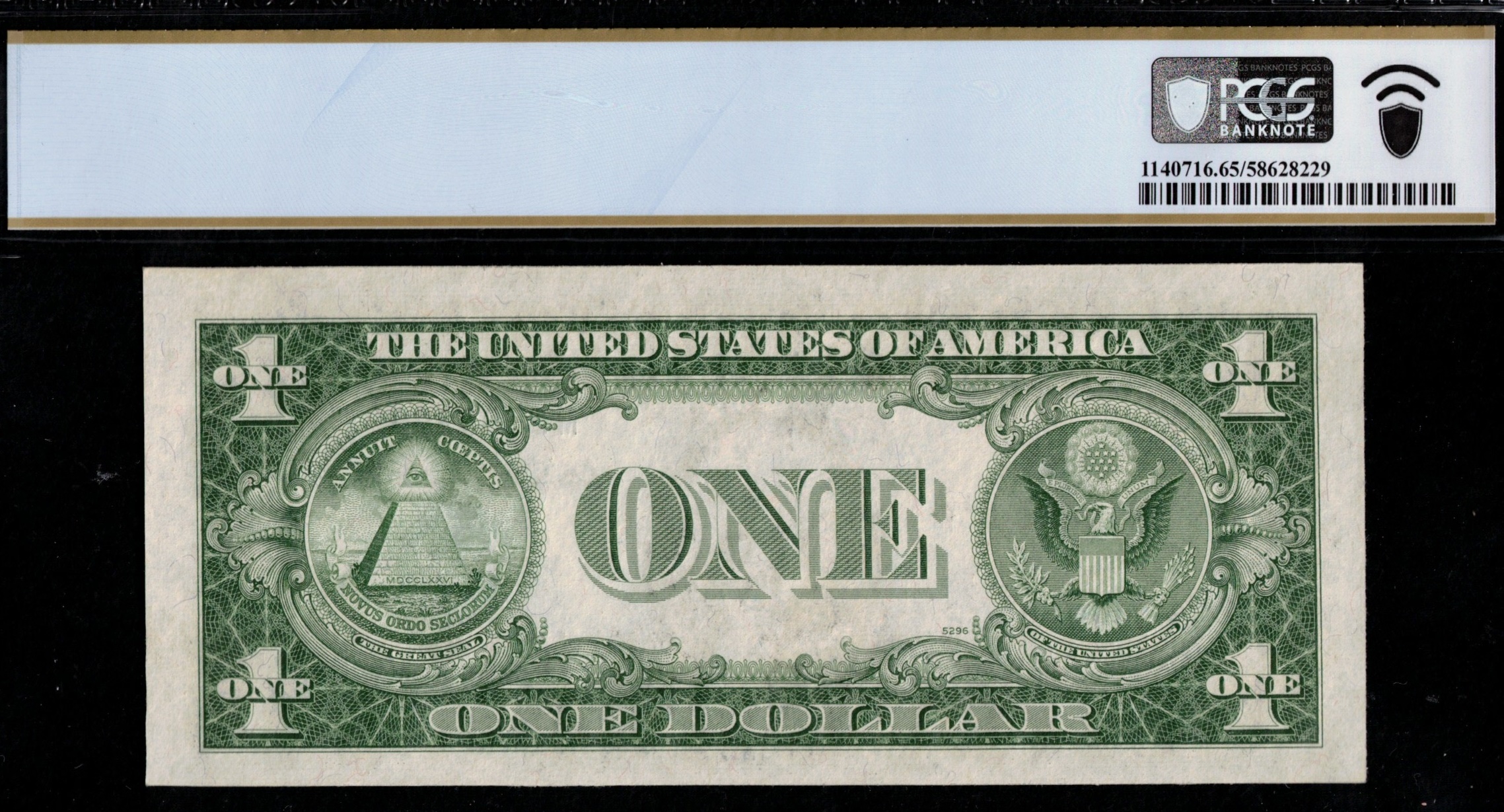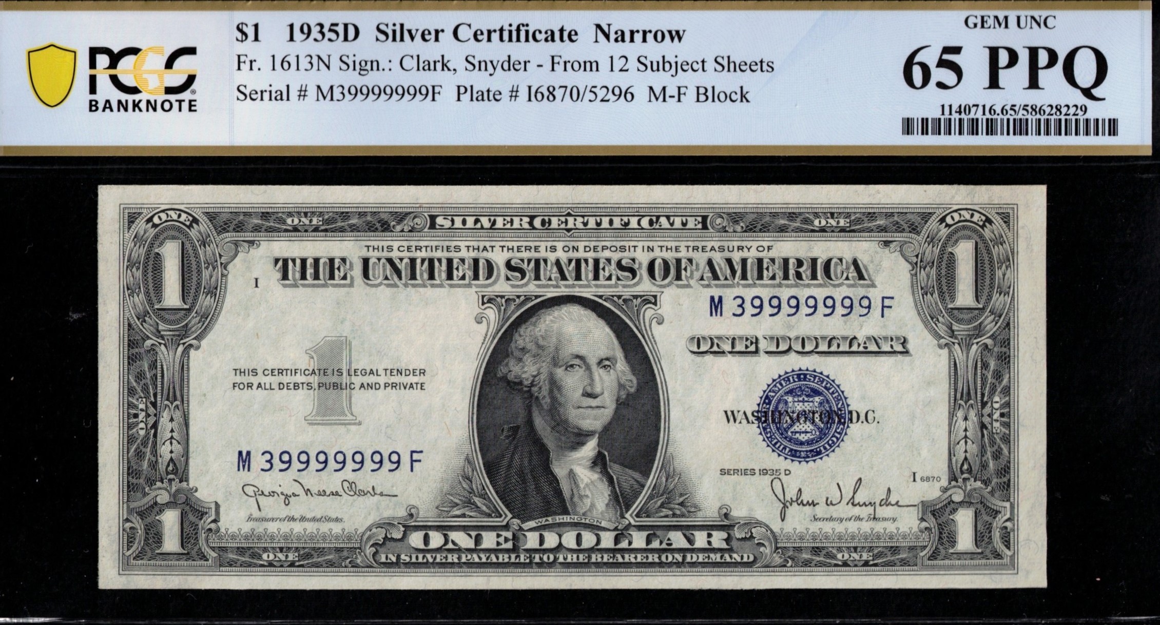 FR-1613N NARROW 1935D Series One Dollar Silver Certificate, having a straight seven nines in the serial number. M39999999F. Pulled from the pack it was in, bright white paper, deep blue inks, centered very well. Third-party graded P.C.G.S #65PPQ Gem Uncirculated with premium paper quality. Just one digit away from a Solid 9’s Serial Number. Wonderful Flipper Serial.