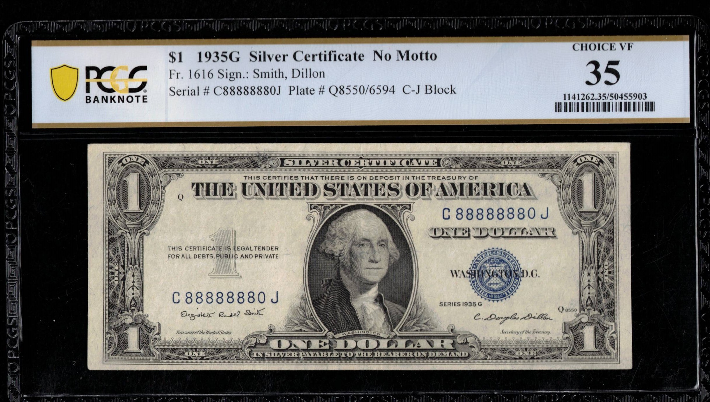 FR-1616 1935G Series One Dollar Silver Certificate featuring a near-solid 8’s serial number, C88888880J, with seven consecutive lucky 8s. Third-party graded by P.C.G.S as #35, very fine to extra fine condition. This is an average circulated note that was saved and preserved for decades, making it a true centerpiece for collectors of silver certificates with rare serial numbers.