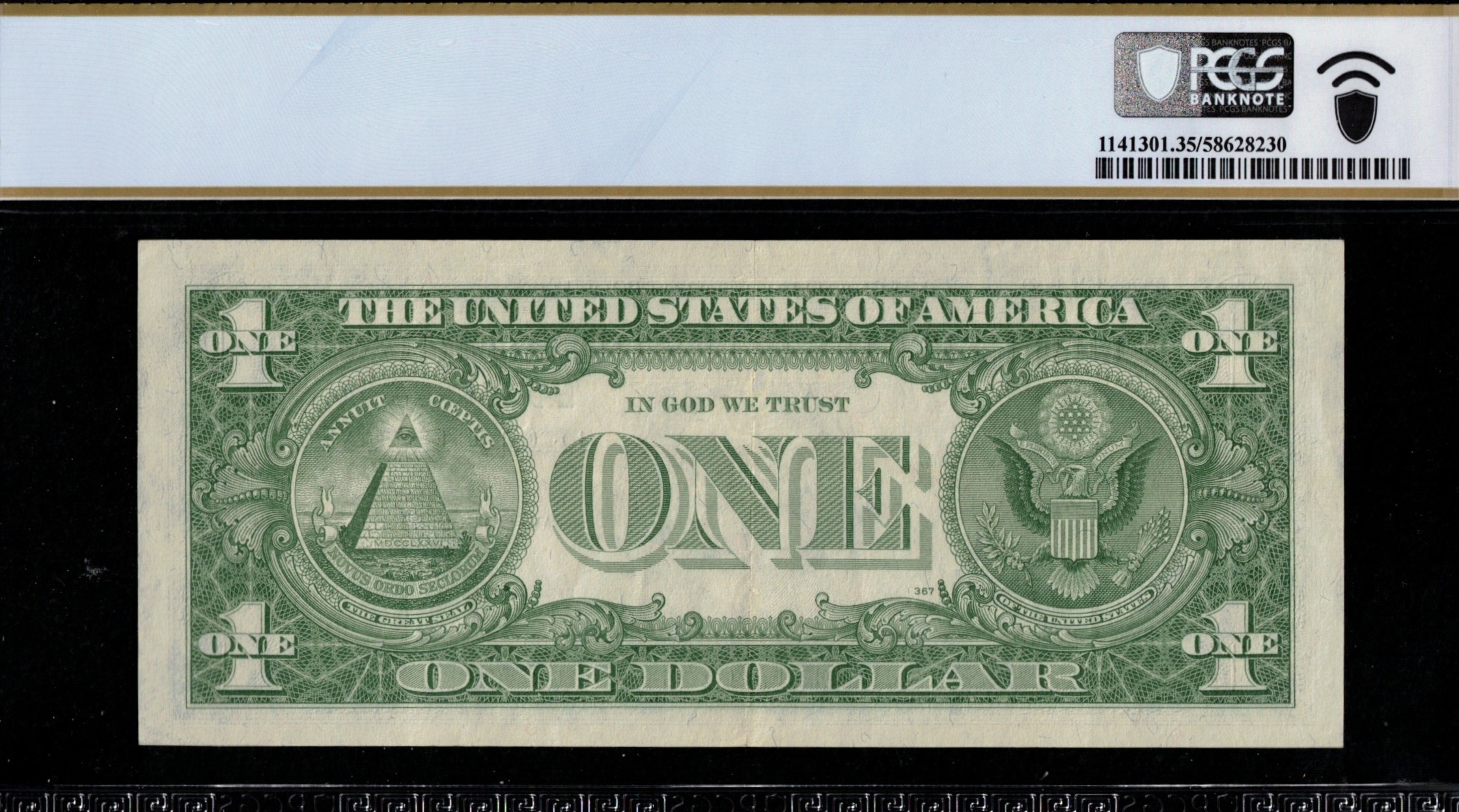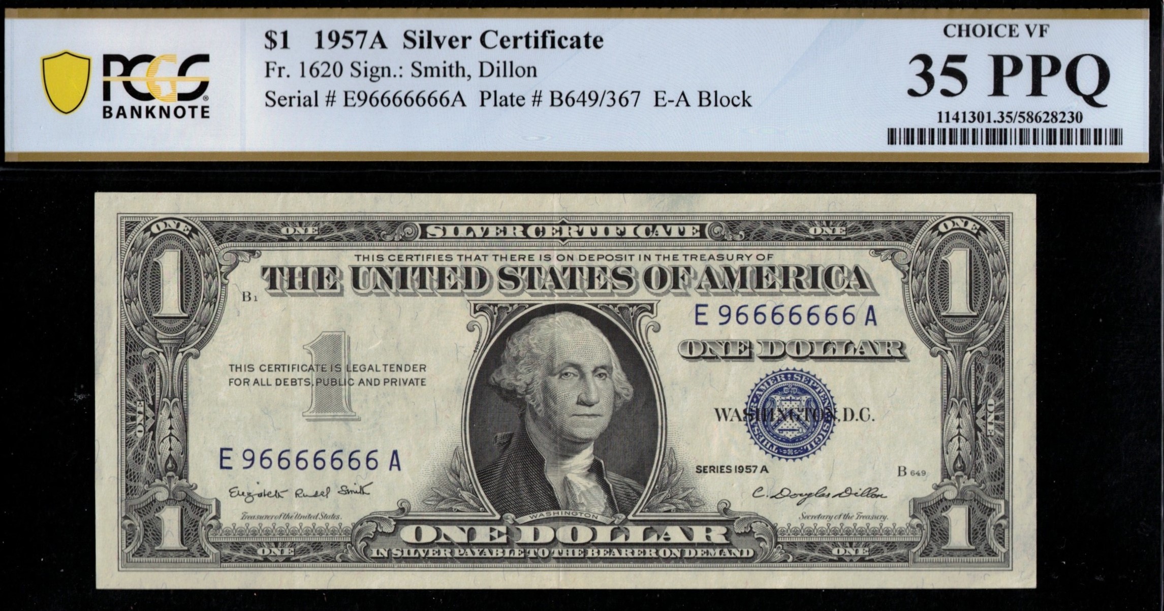 FR-1620 1957A Series One Dollar Silver Certificate having a very cool FLIPPER ninety-six million PLUS serial number. Collect 9-6’S? This one’s got your name on it. E96666666A. Pulled from circulation, with being well-centered, bright, and appears better than the grade it was given. Great looking note despite the given grade. Third-party graded P.C.G.S #35PPQ Very fine to extra fine grade with premium paper quality. Seven straight sixes.